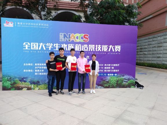10月12-15日,全国第五届大学生水族箱造景比赛在厦门集美大学举行。本次大赛由教育部高等学校水产类教学委员会指导会和水产学国家级实验教学示范中心联席会主办。来自全国各地的37所高校200多名参赛选手集聚集美大学,上演水族箱造景技能大比拼。beat365在线平台官网派出的2位指导老师和5位同学参加了水陆缸组、大缸组和中缸组的比赛。