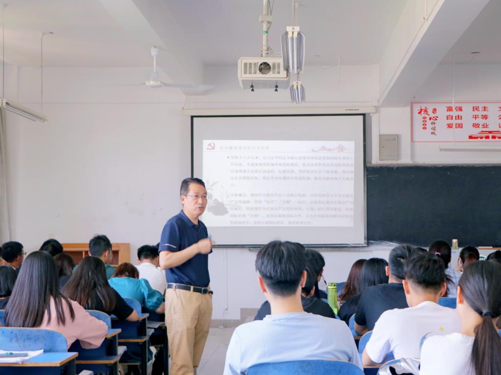 郭旭升书记以“学清风党史,做廉洁新人”为主题,从廉洁、廉政的内涵、党风廉政建设的历史沿革、加强青年大学生廉洁教育的原因、保持廉洁作风的重要性等方面进行阐发,通过廉洁从政先进典型事例,如羊续悬鱼、包拯、优秀共产党员孔繁森等,鼓励同学们向榜样学习,做廉洁新人。最后,他指出,作为一名大学毕业生,即将走向社会,走上工作岗位,要加强自我修养、牢固树立法纪意识,严以修德,明辨是非,笃实做人,书写无愧于时代、无愧于社会、无愧于人民的壮丽人生。