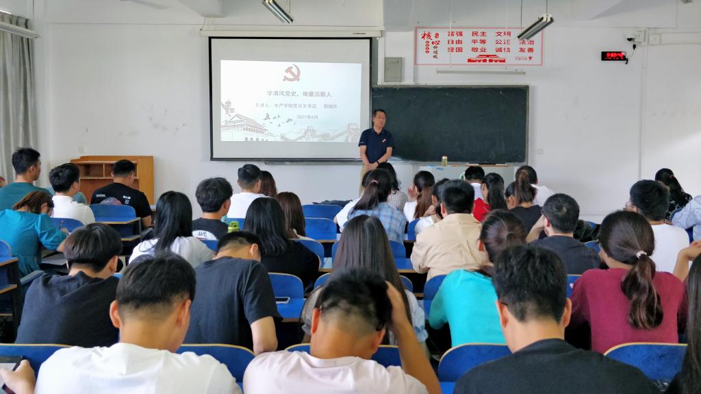2021年6月4日上午10:00,水产学院党总支书记郭旭升为毕业班同学讲了一堂廉洁教育课。院党总支副书记黄光玲、学工组老师及毕业班全体学生参加了此次活动。