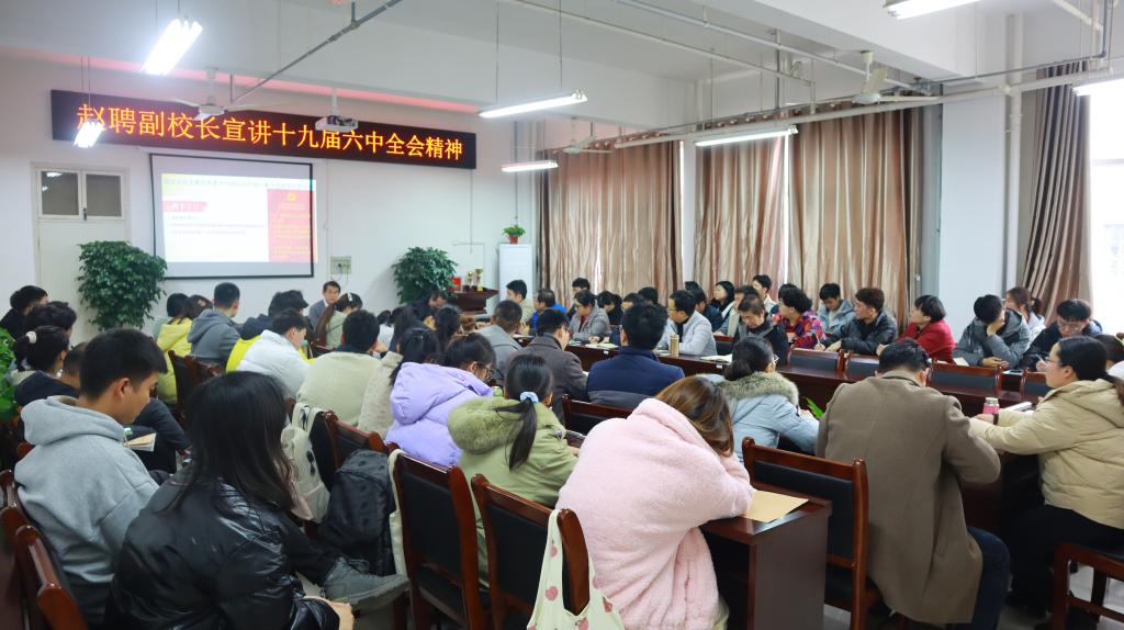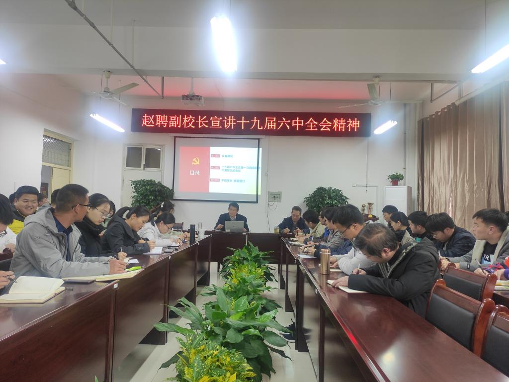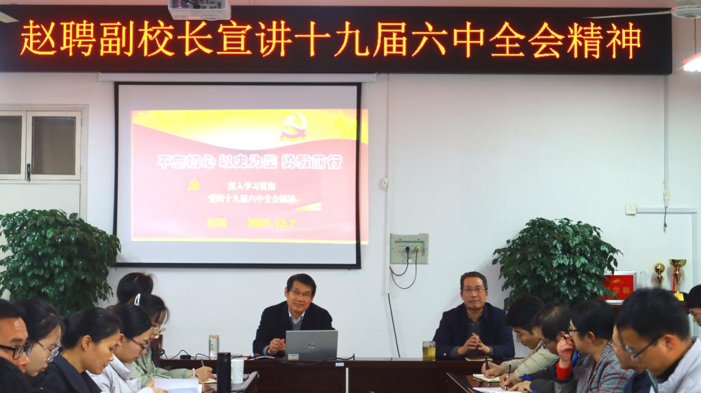 12月7日下午,赵聘副校长到水产学院为全院教职工、联系班级水产养殖学19-1和部分学生党员宣讲十九届六中全会精神。会议由水产学院党总支书记、院长郭旭升主持。