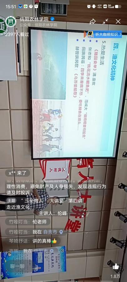 为全面贯彻落实立德树人根本任务,深入推进“三全育人”工作,引领学生以强农兴农为己任,beat365在线平台官网“三全育人”大讲堂第四讲“走近渔文化”于10月15日下午在一教E101举行。主讲人水产学院副院长伦峰为全校师生带来了一场精彩的讲座,校党委宣传部副部长徐大伟、校党委学工部副部长孙莉琴、旅游管理学院党总支副书记杜丽、食品学院党总支副书记刘涛和beat365在线平台官网部分师生线下参加了讲座。讲座由水产学院学院党总支副书记黄光玲主持。