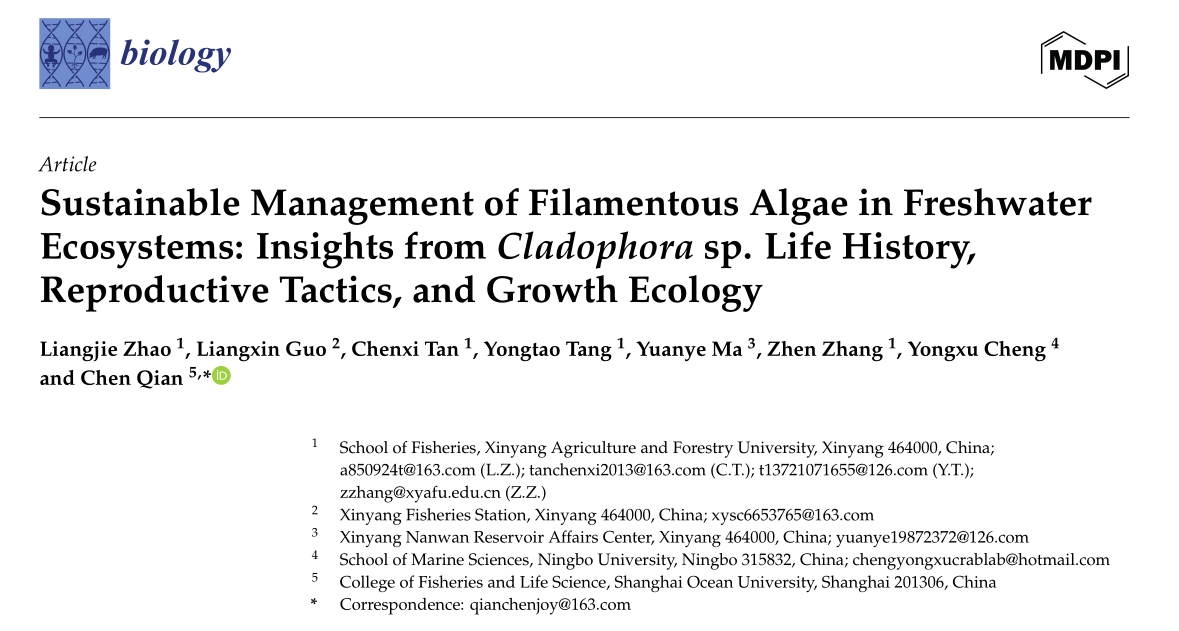 近日,由beat365在线平台官网、上海海洋大学等机构组成的科研团队在国际期刊《biology》(中科院二区)发表题为“Sustainable Management of Filamentous Algae in Freshwater Ecosystems: Insights from Cladophora sp. Life History, Reproductive Tactics, and Growth Ecology”的新研究。该研究首次解析了一种淡水刚毛藻(Cladophora sp.)独特的繁殖策略,发现其通过“细胞质团块释放”机制实现高效繁殖,并明确了温度与营养条件分别驱动无性孢子与有性配子形成的差异化响应规律。该成果为预测和防控淡水丝状藻类水华提供了关键科学依据。