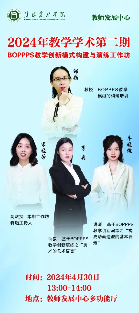为有效提升青年教师课堂创新能力,优化教学效果,提高教学质量,教师发展中心拟开展“BOPPPS教学创新模式构建与演练工作坊”活动,活动具体安排如下: