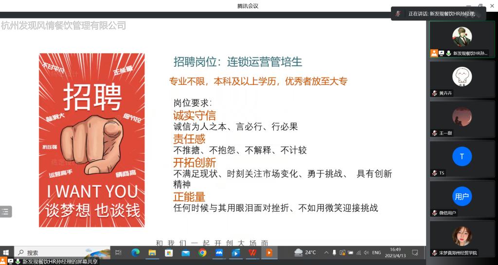 为拓宽2023届毕业生就业渠道,促进毕业生更加充分更高质量就业,4月13日下午,食品学院邀请杭州发现风情餐饮管理有限公司举行了线上专场招聘宣讲会,2023届毕业生积极参加。