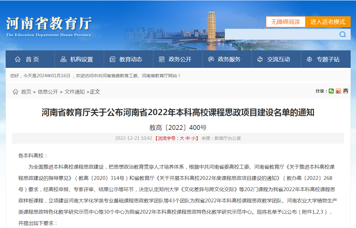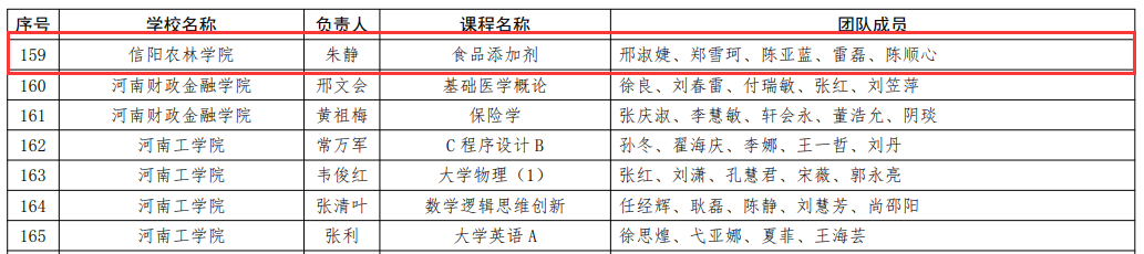 根据《河南省教育厅关于公布河南省2022年本科高校课程思政项目建设名单的通知》(教高〔2022〕400号),经学校推荐申报、省教育厅组织专家评审和结果公示等环节,决定认定我院《食品添加剂》为河南省2022年本科高校课程思政样板课程。