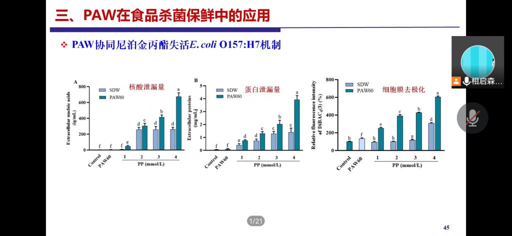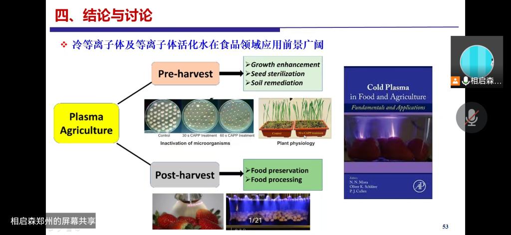 相启森副教授的报告主题为“冷等离子体及等离子体活化水在食品杀菌保鲜中的应用研究”,主要介绍了冷等离子体的基本概念及特性,如具有效率高、操作简单、处理时间短、安全、无残留等诸多优点,在杀虫、降解真菌毒素、失活食品内源酶、食品包装材料灭菌等领域具有良好的应用前景;等离子体活化水的基本概念;冷等离子体及等离子体活化水在食品保鲜领域的应用研究进展。