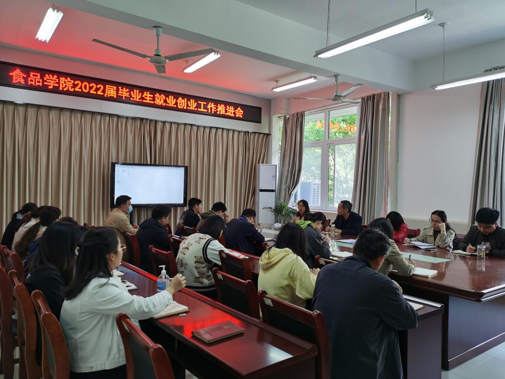 为深入贯彻党的十九届六中全会和河南省第十一次党代会精神,全面落实全国、河南省普通高校毕业生就业创业工作网络视频会议部署,切实做好毕业生就业创业工作,4月19日,食品学院在实验楼1B206会议室召开2022届毕业生就业创业工作推进会。院领导班子成员、全体教职工参加会议。