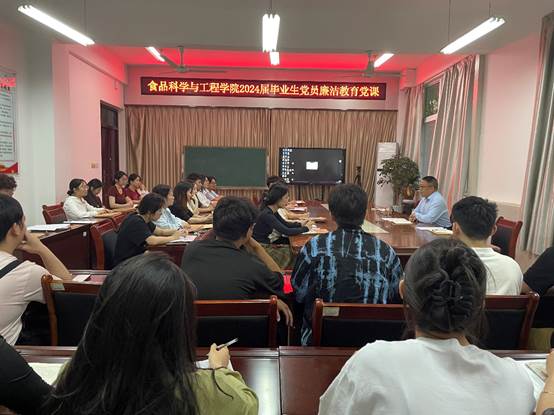 6月4日下午,食品科学与工程学院在科技楼1B206会议室召开了2024届毕业生党员廉洁教育党课。学院党总支书记李海祺主讲,组织员王子伟参加。