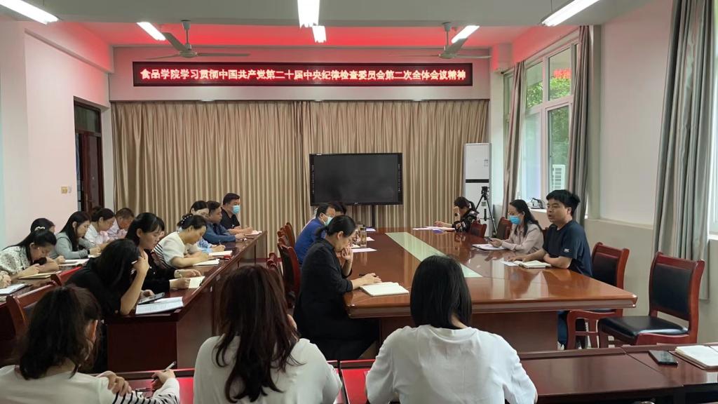 5月16日,食品学院全体教职工在科技楼1B206会议室集体学习二十届中央纪委二次全会精神。会议由食品学院党总支副书记刘涛主持。