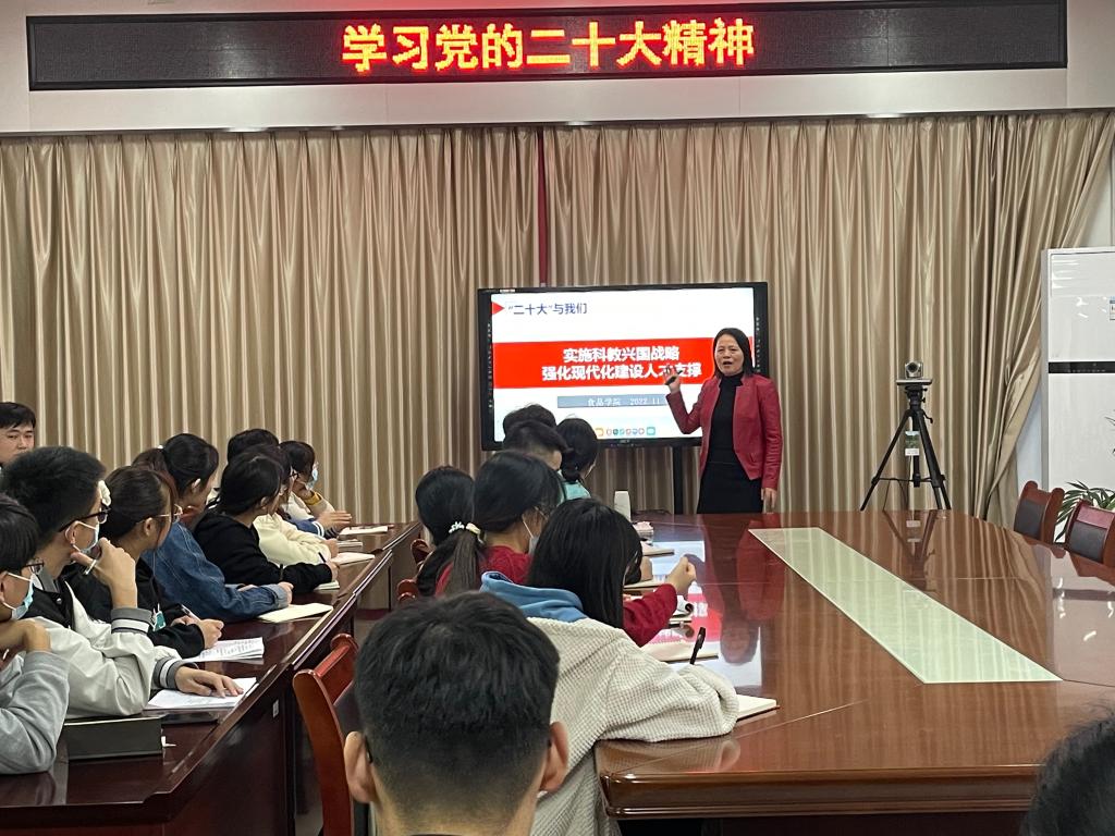 11月16日,食品学院在科技楼1B206举办学习党的二十大精神主题党课。院长邢淑婕以“实施科教兴国战略强化现代化建设人才支撑”为题讲授党课,60余名学生党员参与学习。