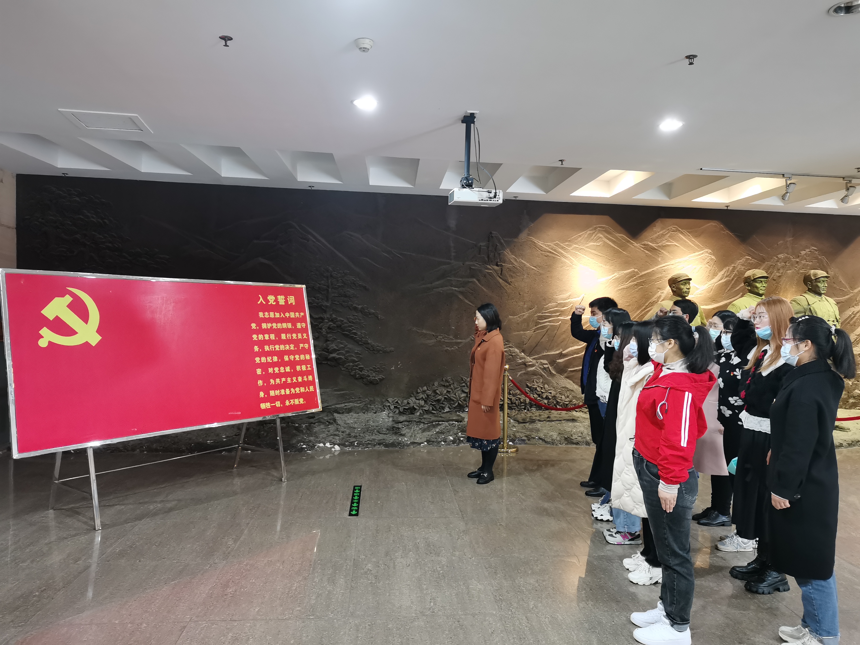 进馆参观前,易蕾老师带领参与活动的师生重温了入党誓词。参观过程中,大家沿着历史足迹,依次参观了展馆中“大别风雷,星火燎原;红军摇篮,将军故乡;红色苏区,共铸辉煌;红色土地,艰苦卓绝;江淮抗战,中流砥柱;中原突围,铁流千里;千里跃进,伟大壮举;将星璀璨”等八大部分。馆内经典场景的蜡像,生锈的武器、工具,发霉的布票、衣物,用最生动的语言向师生们讲述了大别山的红色故事。