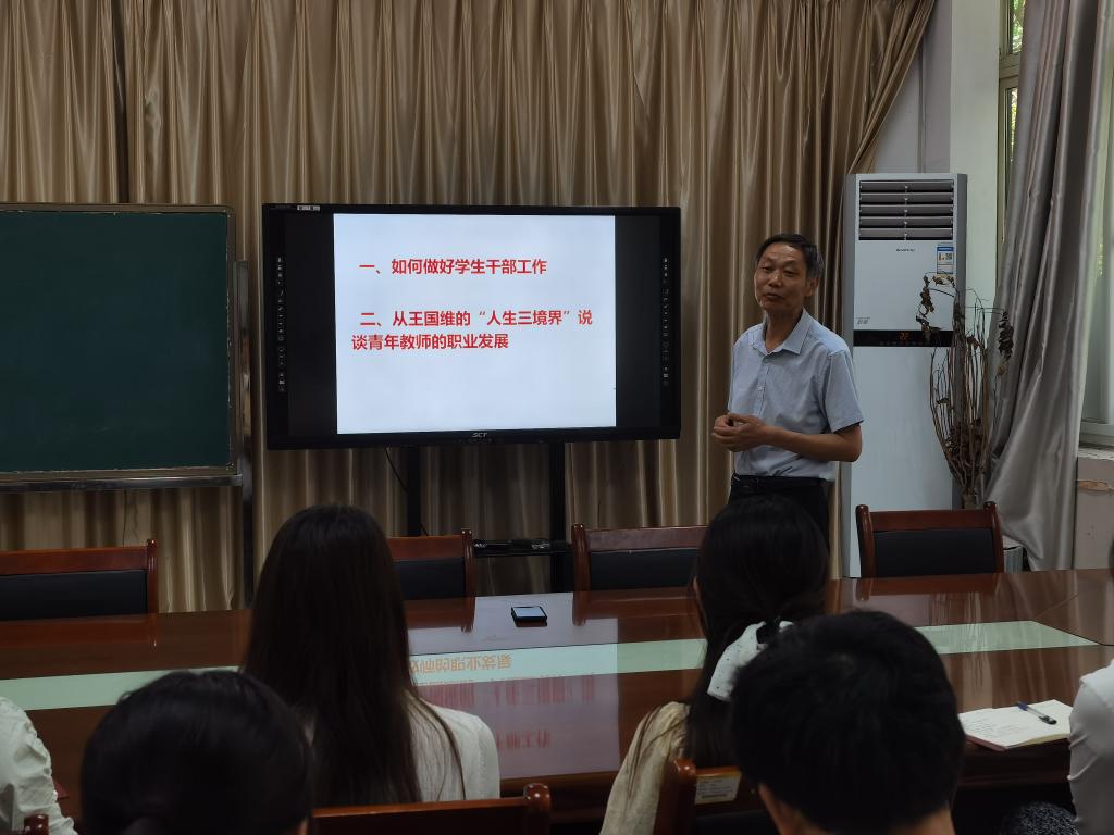随后,夏新奎主任引用王国维"人生三境界说"为青年教师阐释教师职业发展三阶段:职业初期,需明确目标,勇敢启程;目标明确后,要坚韧行动,克服困难;后期,则需持久积累,终获顿悟。他强调,成功需保持谦逊,开启新循环。并着重强调在各阶段都应坚守廉洁从教的底线:初入职业,需立定志向、筑牢廉洁思想根基;确立目标后,应恪守师德规范、廉洁执教;经历积淀后,更要以身作则、成为廉洁表率。夏新奎还带领大家重温了习近平总书记在纪念中国关心下一代工作委员会成立30周年暨全国关心下一代工作表彰大会上的重要讲话精神。强调:广大“五老”是党和国家的宝贵财富,是加强青少年思想政治工作的重要力量。充分发挥老同志在理想信念教育、思想道德教育、革命传统教育等方面的特殊优势和不可替代的作用是加强青少年思想政治工作的重要力量。