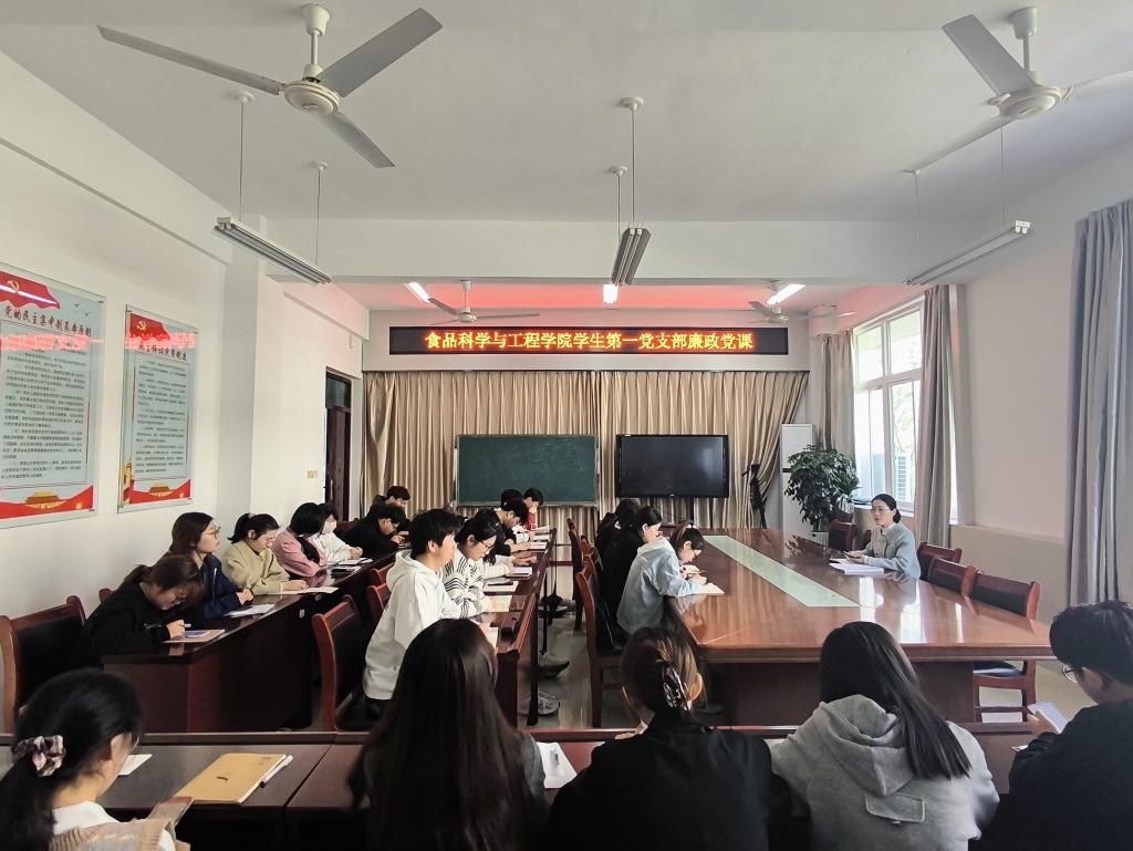 为进一步提高学生党员的思想政治素质,强化廉洁自律意识,增强廉洁从业、廉洁修身、廉洁齐家的思想自觉,打牢道德根基,3月29日,食品科学与工程学院学生第一党支部书记黄卉卉在科技楼1B206为支部党员上廉政党课。