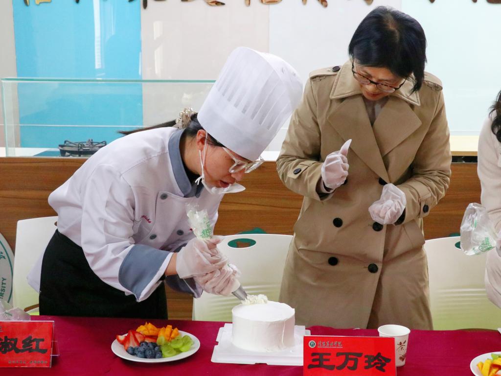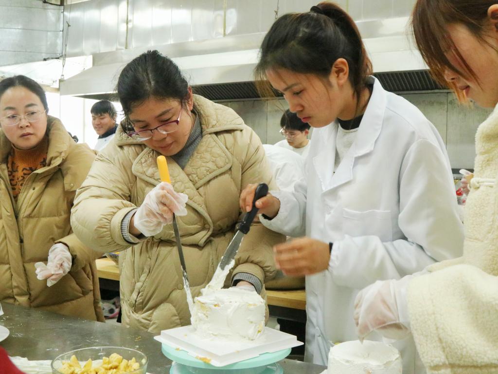 活动现场进行了精心筹备。学院专业教师团队全程悉心指导,从奶油打发的关键技巧、细腻的抹胚手法,到精致的裱花装饰要领,都进行了标准化演示。同时,在演示过程中巧妙融入食品安全与营养搭配知识的讲解,充分彰显了学院的学科和专业特色。在实践环节,女教师们充分发挥自身创意,纷纷化身“甜点设计师”。她们依托专业设备,精心构思每一个细节,亲手制作完成精美的蛋糕,传递了节日的温暖与美好祝福。
