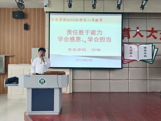 为了培养大学生的道德修养,促进其身心发展,增强大学生的社会责任感,9月28日上午,食品学院党总支副书记刘涛老师在一教E101做了题为“责任胜于能力学会感恩、学会担当”为主题的报告会,食品学院2023级全体新生聆听了报告。