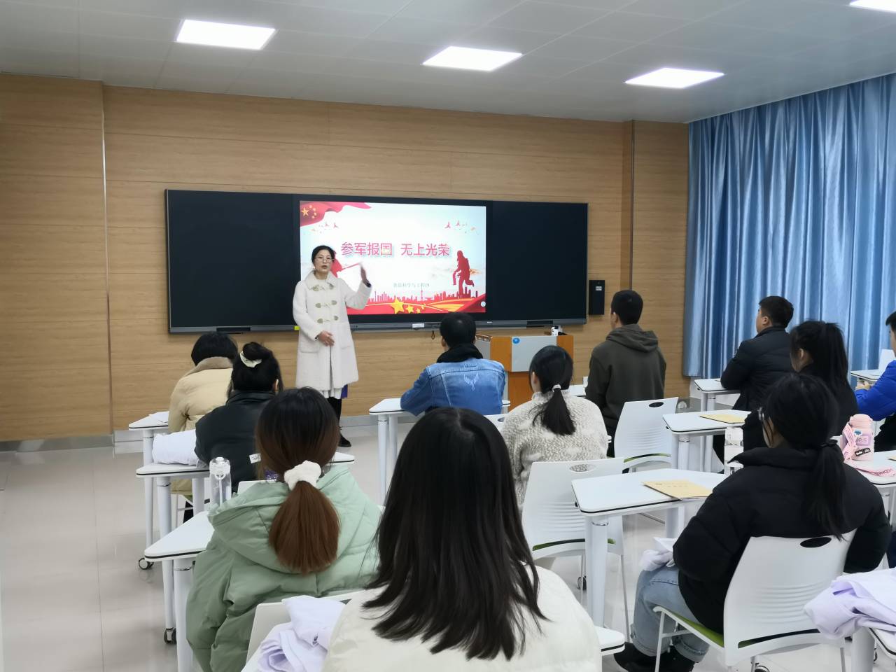 班会上,各位辅导员老师向同学们宣传了参军入伍学生优惠政策,说明了征兵工作的身体、年龄等入伍条件及应征入伍的步骤,就同学们在学习深造、职业发展上的疑问进行了解答。本次班会,增进了同学们对国防知识和国家征兵入伍政策的了解,鼓舞了同学们的参军热情,激发了同学们的爱国之情。
