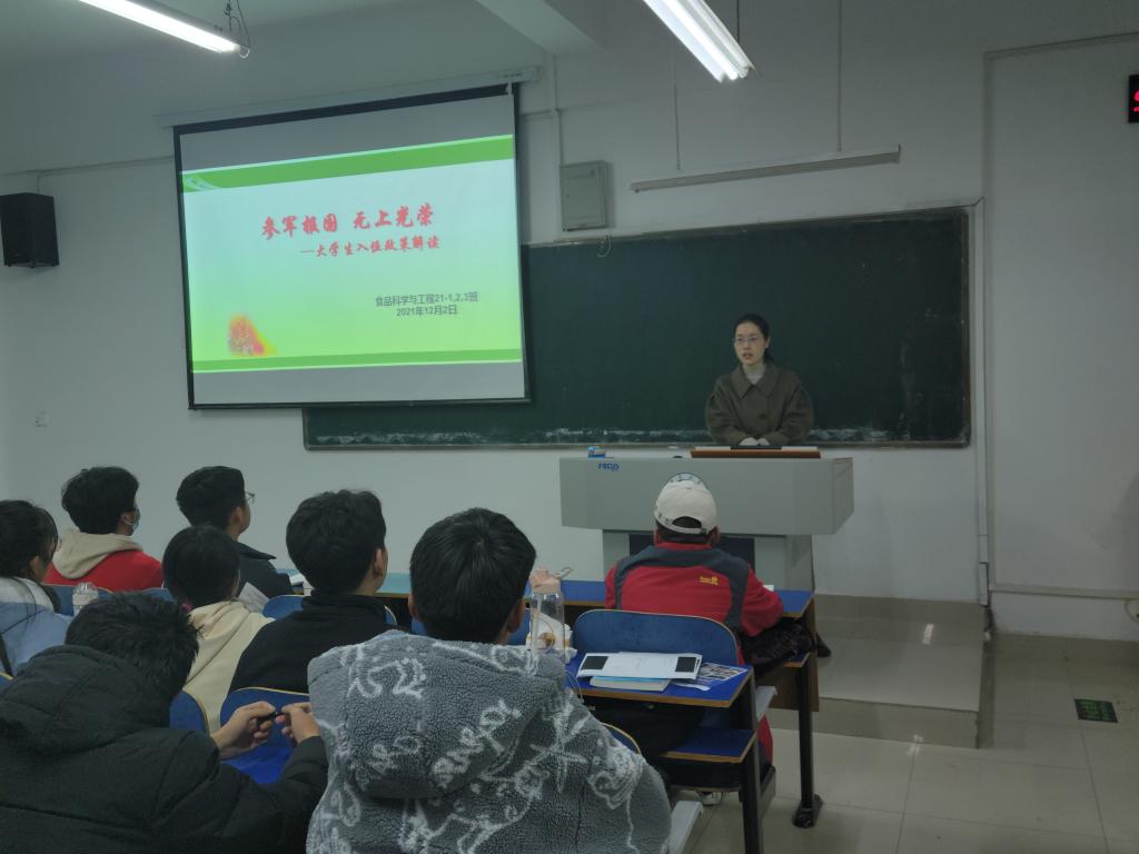 为了牢固树立忧患意识和使命意识,2021年12月1日-7日,食品学院各班级辅导员陆续开展了征兵宣传动员主题班会。