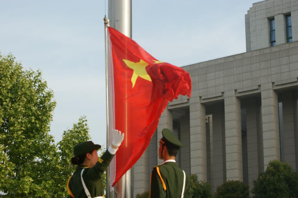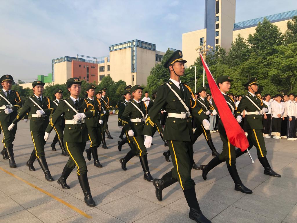 在全体师生的注目礼下,英姿飒爽的国旗护卫队护送鲜艳的五星红旗进场,伴随着庄严的中华人民共和国国歌,五星红旗冉冉升起,迎风飘扬,在场的每一个人向国旗行注目礼,齐唱国歌,满怀对祖国的敬意和热爱。