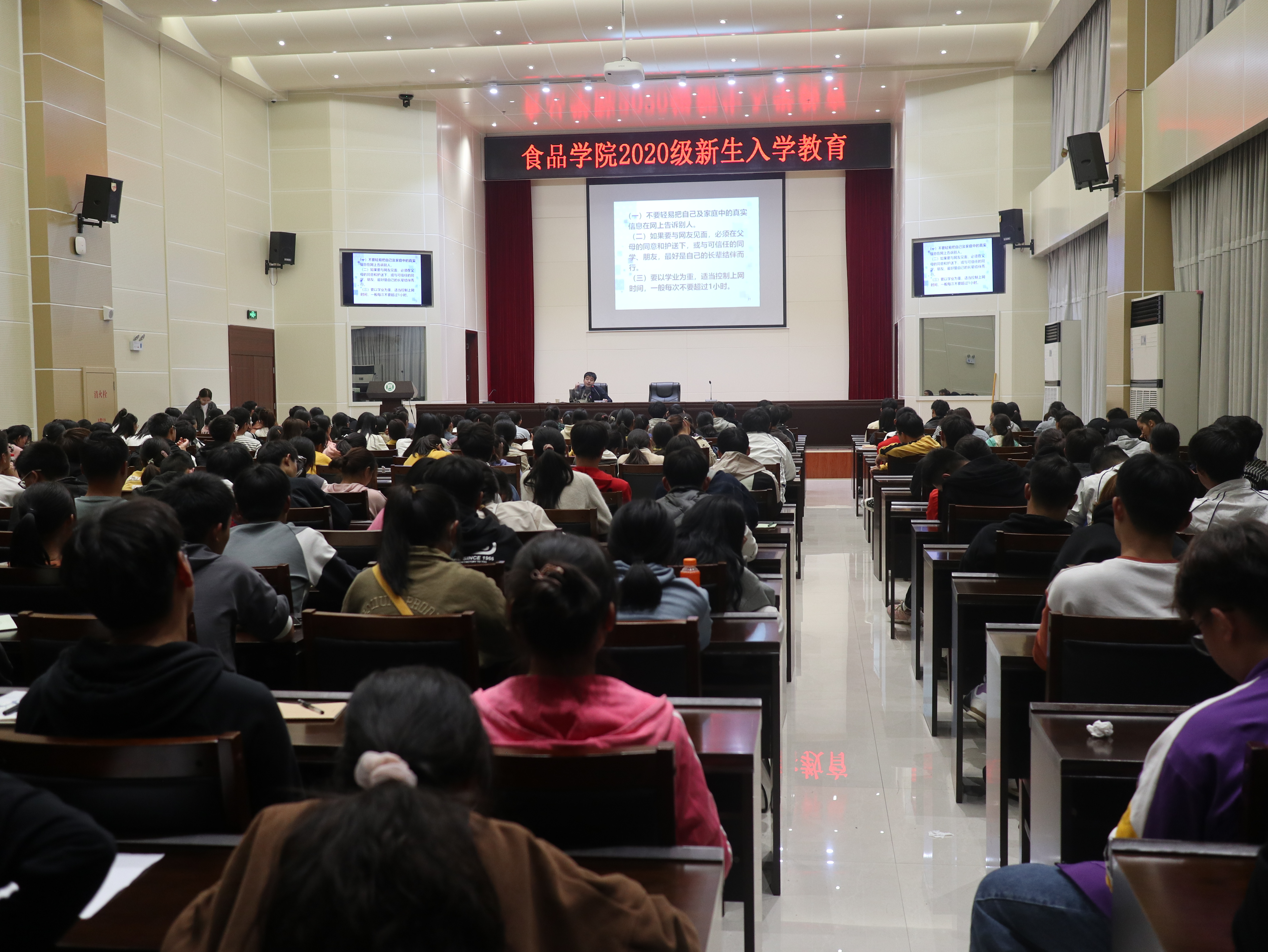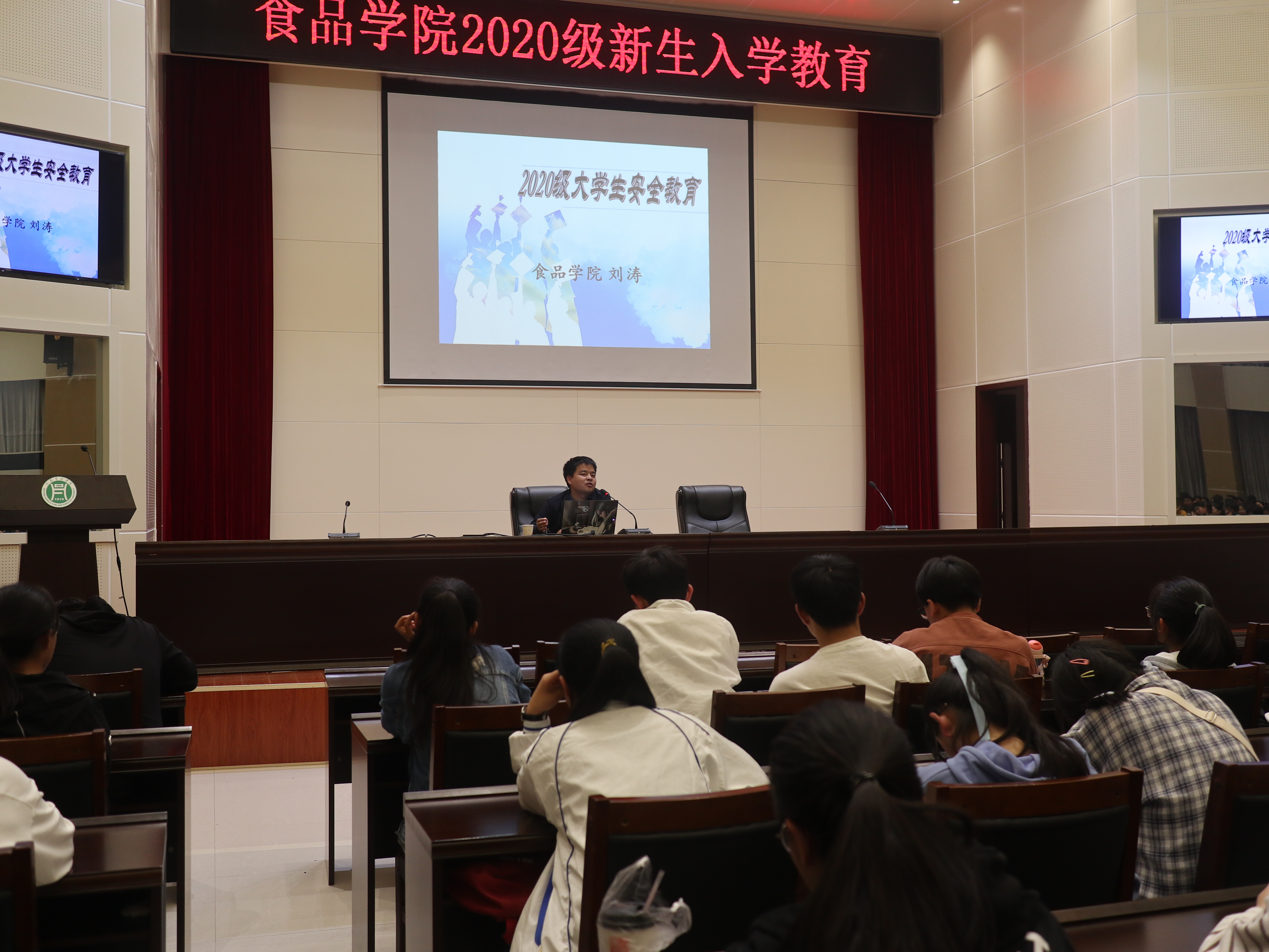 为提高学生的安全防范意识,构建文明和谐、平安稳定的校园环境,10月22晚,食品学院党总支副书记刘涛老师于图书馆六楼报告厅为2020级全体新生做关于大学生安全教育的报告。