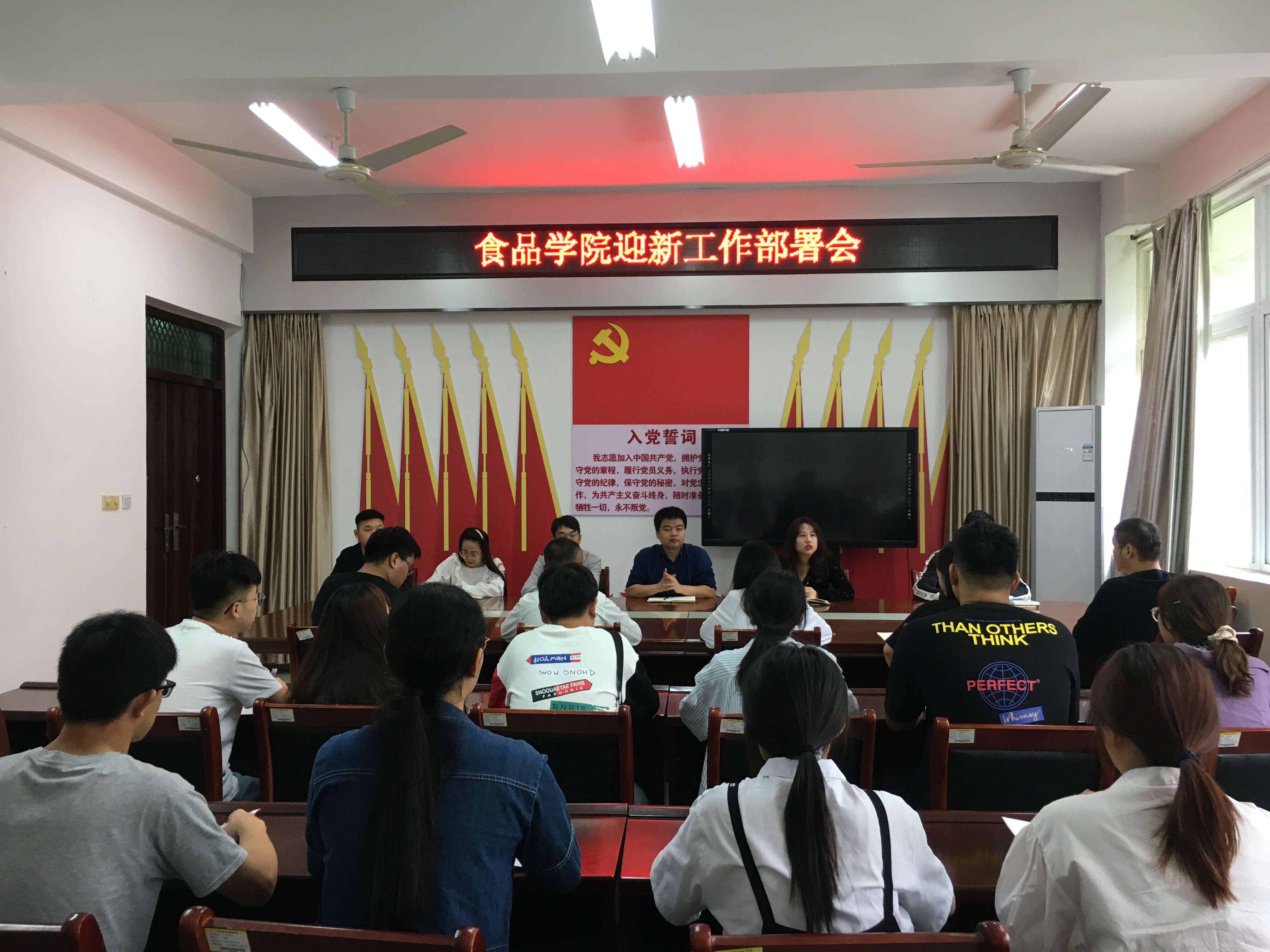 为进一步做好2020级新生入学报到的相关工作,充分调动学生干部的工作积极性,食品学院于2020年9月29日下午在1B206室召开了迎新工作安排部署会,食品学院党总支副书记刘涛、院团总支书记易蕾、新生辅导员柳诚刚、靳羽慧、孙鹤、曹蒙及院全体学生干部参加会议,会议由院团总支书记易蕾主持。