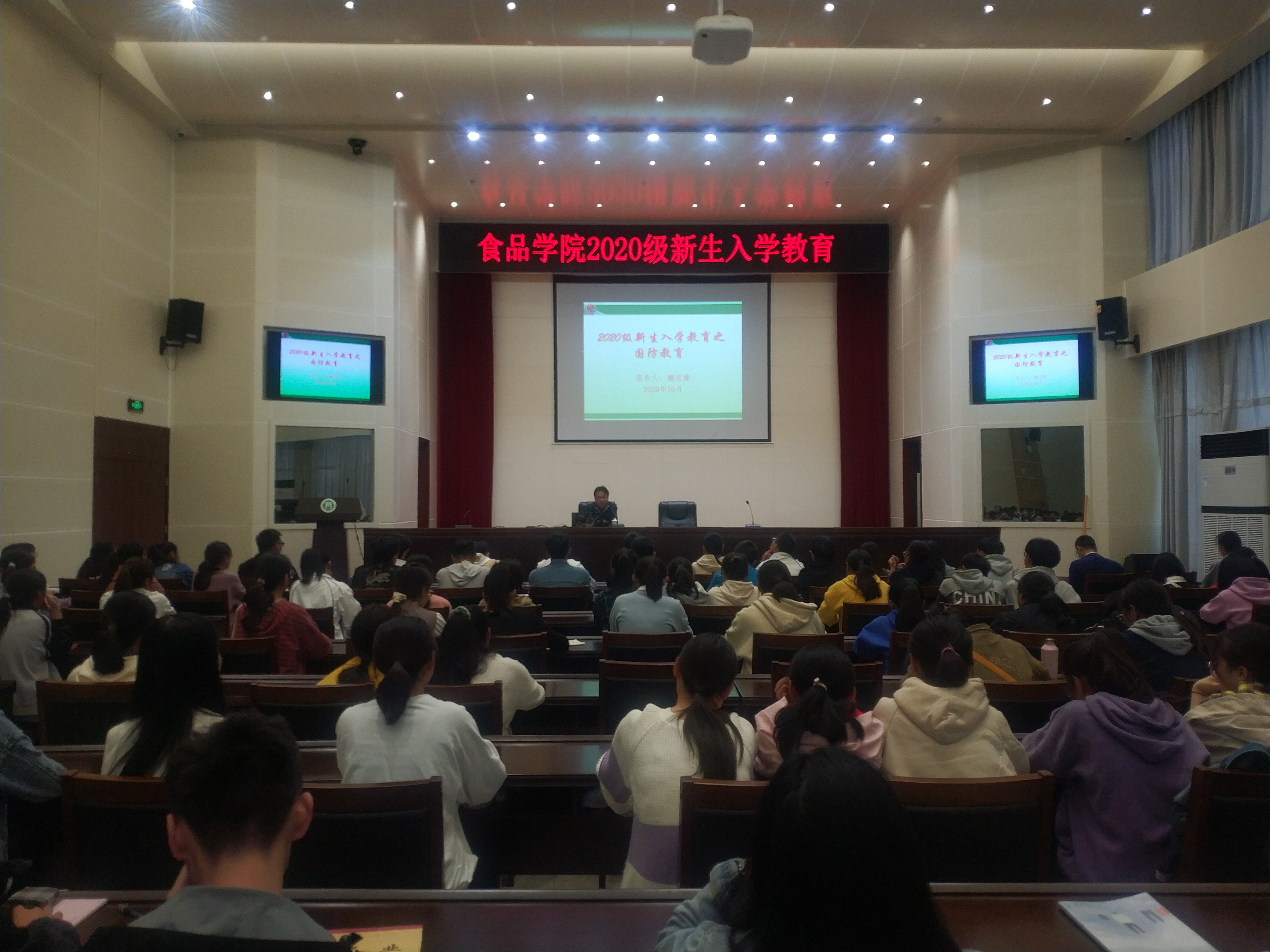 为更好的让学生了解当前的国际形势,了解国家的发展动向,理解爱国主义精神,10月22日晚,食品学院在图书馆六楼报告厅召开了“国防教育”主题报告会,会议特邀校武装部魏宗烽老师主讲,食品学院2020级全体新生参加。
