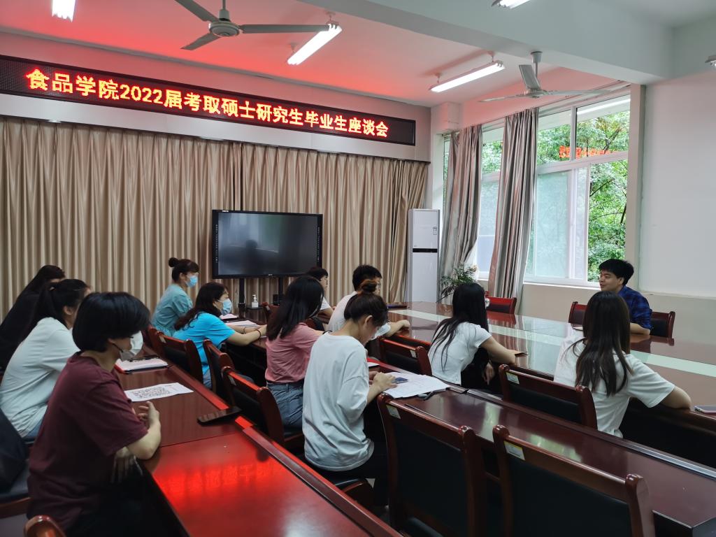 5月25日上午,食品学院在实验楼1B206会议室召开2022届考取硕士研究生毕业生座谈会。院党总支副书记刘涛出席座谈会并讲话,学工组辅导员老师以及考取研究生的学生代表等20余人参加了座谈会。