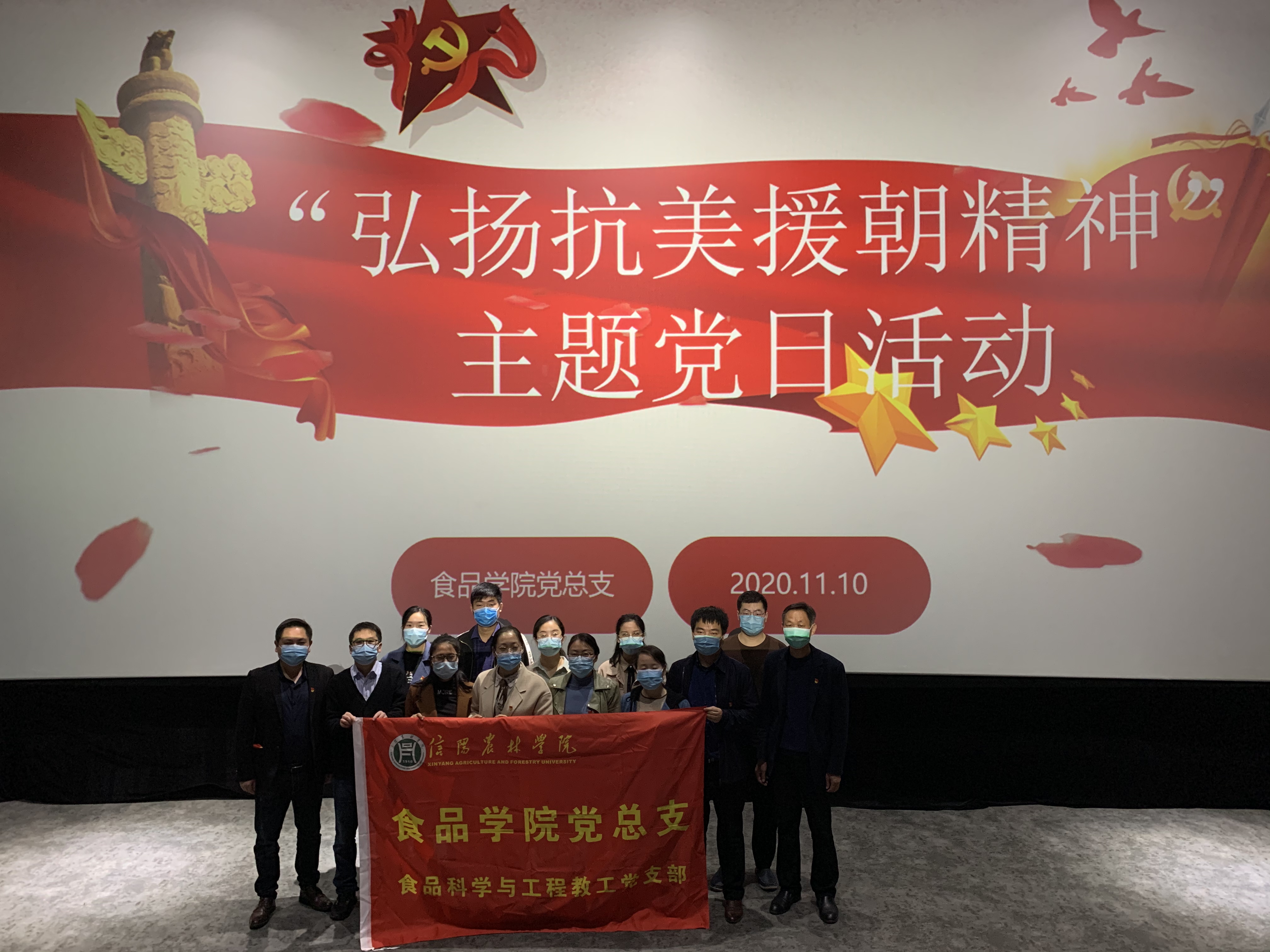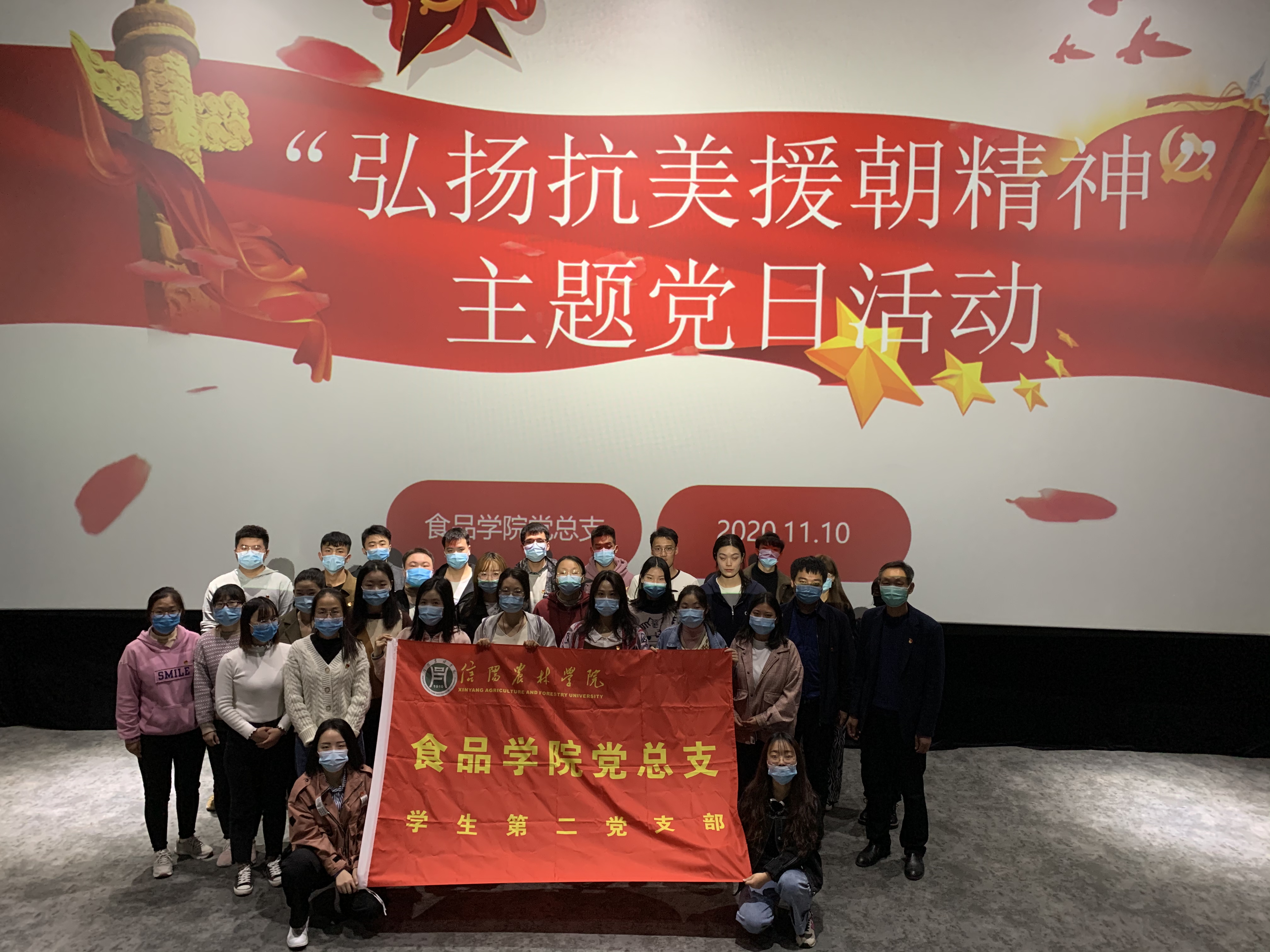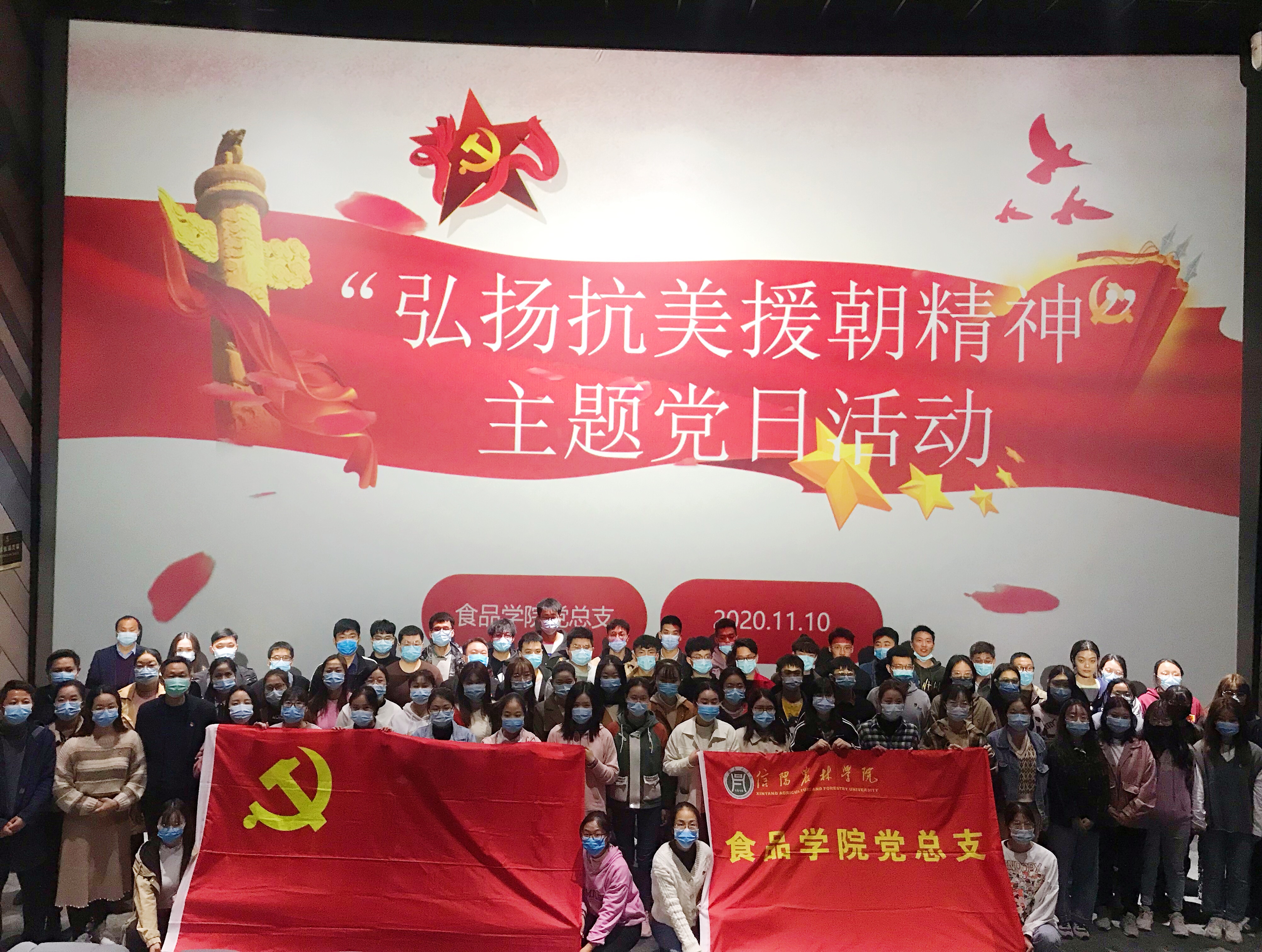 为了弘扬“抗美援朝精神”,铭记历史、致敬英雄,引导党员筑牢理想信念之魂,提高党员干部们的思想政治素质,在新时代继承和弘扬伟大抗美援朝精神,11月10日中午食品学院食品科学与工程教工党支部、学生第一党支部和学生第二党支部开展主题党日活动,组织全体党员及入党积极分子观看抗美援朝题材电影《金刚川》。