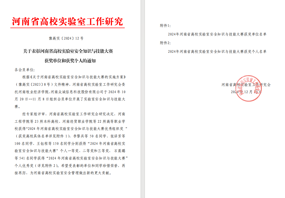 beat365在线平台官网荣获“2024年河南省高校实验室安全知识与技能大赛”优秀组织奖