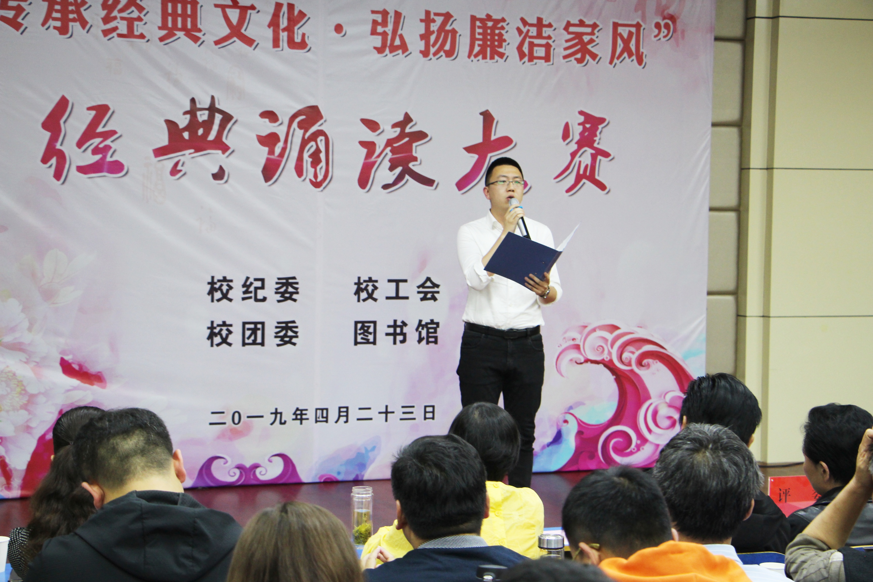为丰富阅读推广活动内容,展现广大教师风采,4月23日下午3点,图书馆联合校纪委、工会、团委举办的“传承经典文化,弘扬廉洁家风”经典诵读活动决赛在一号教学楼E101教室举行。校党委副书记扶庆、纪委书记李强、工会主席黄遵东,校纪委委员、各分工会主席、各党总支纪检委员、部分师生代表300余人参加了本次活动。