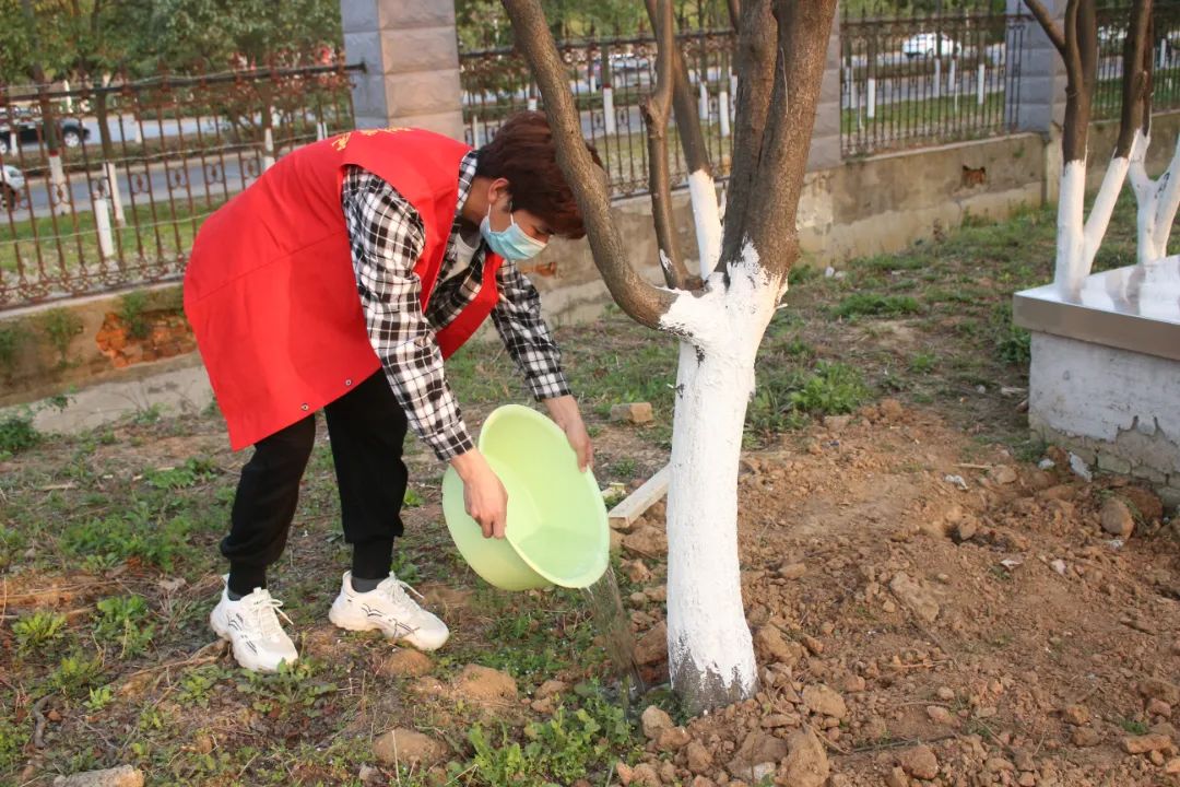 随后,同学们在孙羽佳老师的带领下,在学校主干道两侧的绿化带中忙碌着,为树木松土、清洁灌木丛中的废弃物,摆放整齐校园共享单车、清洁环境卫生,向同学们宣传植绿护绿的相关知识。最后大家来到桃园,对花草树木进行松土、浇水工作,并在护绿过程中,与小树合影留作美好纪念。