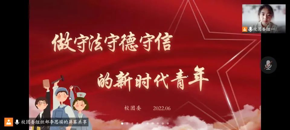 为持续引导广大青年学生学习贯彻习近平总书记在庆祝中国共产主义青年团成立100周年大会上的重要讲话精神,大力弘扬社会主义核心价值观,加强青年学生法治意识教育、廉洁自律教育,利用好假期宝贵时光不断充实和完善自我。校团委于6月24日上午利用腾讯会议线上召开了“做守法守德守信的新时代青年”的示范性主题团日活动。校团委老师、校青马工程及校院学生组织代表一起参与了此次活动。活动中,与会师生齐唱国歌、团歌,重温了入团誓词。