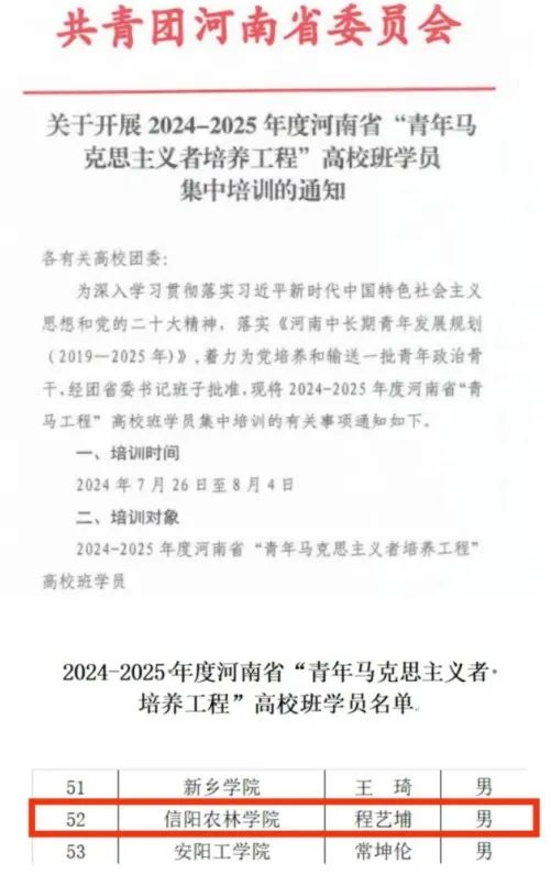 近日,共青团河南省委公布了2024-2025年度河南省“青年马克思主义者培养工程”高校班学员名单。beat365在线平台官网药学院程艺埔同学成功入选,本次“青马工程”高校班学员共100名。