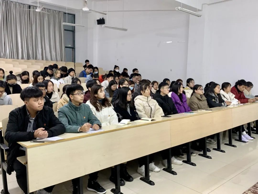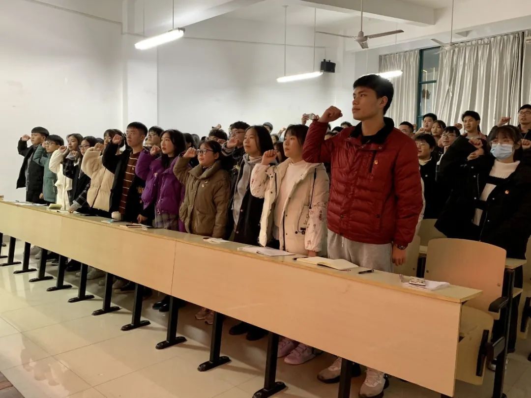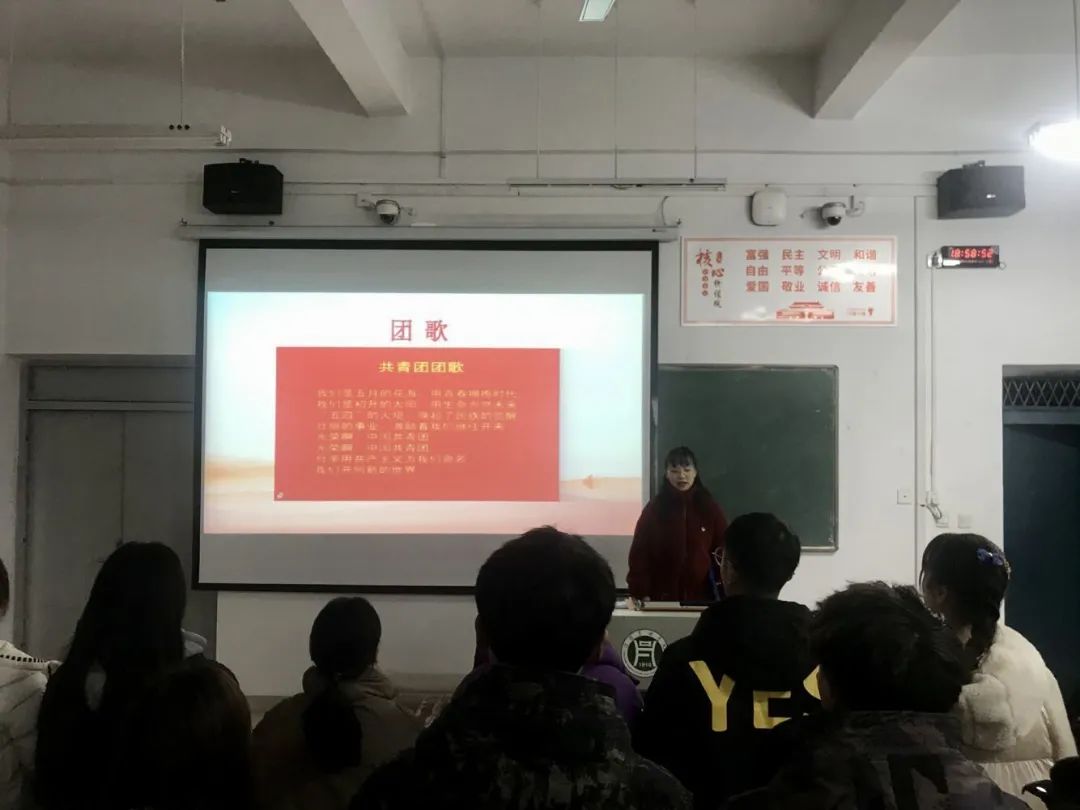 到场学生代表佩戴团徽,激昂宣誓,同唱团歌。同学们在胡静静同学的讲授中积极学习了党的十九届五中全会精神。理论学习结束,两位学生代表依次发言,表明当下使命,期盼美好未来。