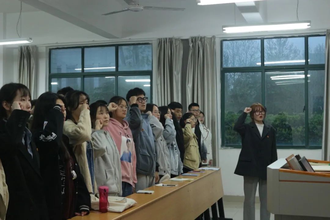 到场学生代表佩戴团徽,面向团旗、重温入团誓词、同唱团歌。在主持人的讲述中,同学们再次学习了习近平总书记在党史学习教育动员大会上的重要讲话精神,进一步明确了新时代大学生学习党史的重要意义。
