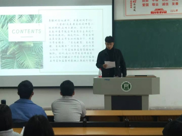 会上,团总支书记彭浩发表讲话,对上一届学生会的工作表示肯定,对学生会全体成员的付出表示感谢。随后,18级学生会主席陈坤对过去一年的学生会组织现状、学院活动、宣传成绩等方面进行总结。选举活动开始,5位候选人逐一上台演讲,分别阐述了自己的优势和目标,充分表明了对学生会的认识。本次选举通过学生自拟自荐报告,资格审查,由学院团总支依据申请人的综合能力、智育成绩、综测成绩等因素进行审核,最终经为期一周的公示后选择出了以赵严为代表的团总支学生会主席团。