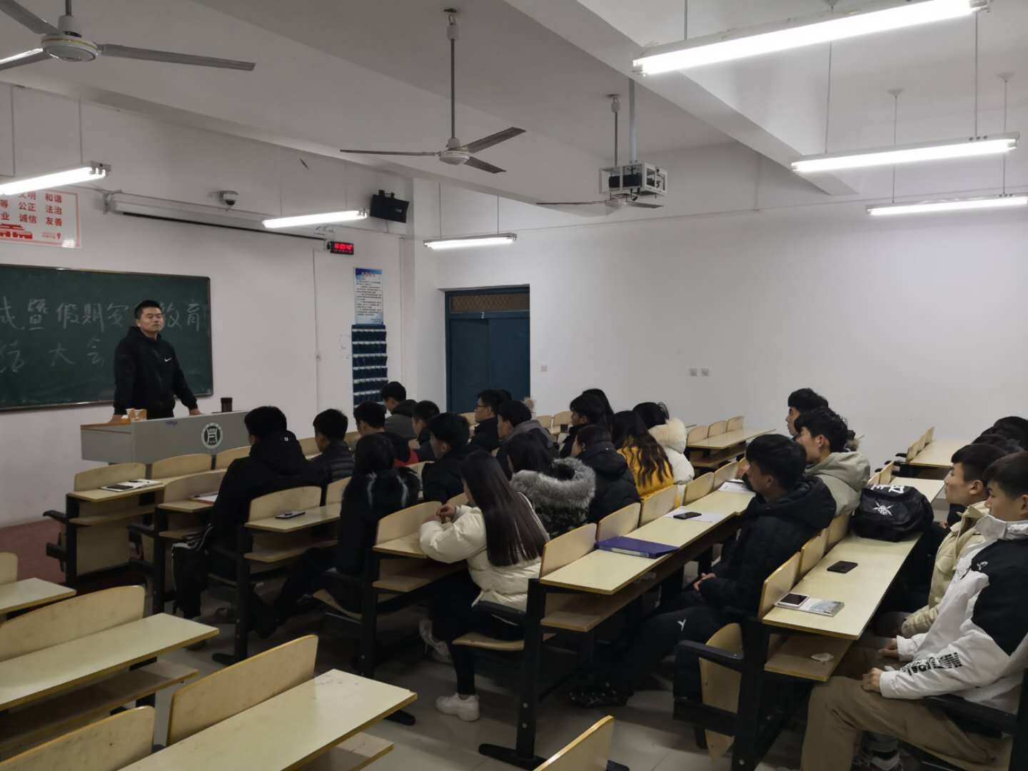 2018年1月8日,体育教学部在二教212B召开了“诚信考试暨假期安全教育”为题的班会,首先,由办公室主任李远胜为即将到来的期末考试做了动员,要求同学们一定要加强诚信考试意识,不作弊、不扰乱考场纪律,自觉维护诚信校园建设。同时强调了学生们在半年的学习和生活中存在的不足并再次重申了学校印发的大学生管理手册中的相关制度,要求学生们严以律己,以一个当代大学生应有的素质去约束自己,规划好自己在校期间的学习目标。其次,李远胜主任就寒假期间的安全提出了要求,要求同学们在离校前,一定要保管好自己的贵重物品,在乘坐交通工具回家的途中,不允许私自下车,电话要随时保持畅通,以便和老师、家人保持联系。预防电信诈骗、传销。最后,由班主任彭浩对本年度学生的学习、工作和生活做出了总结。对一些违规违纪现象做出了严肃批评,对一些班干部在工作中出现的失职、失责现象提出了严令整改的要求。他希望在新的一年里,同学们能给整个体育教学部带来新的气象。有则改之,无则加勉。愿同学们在未来的大学生涯中积极向上,为自己美好的未来拼出一片蓝图。
