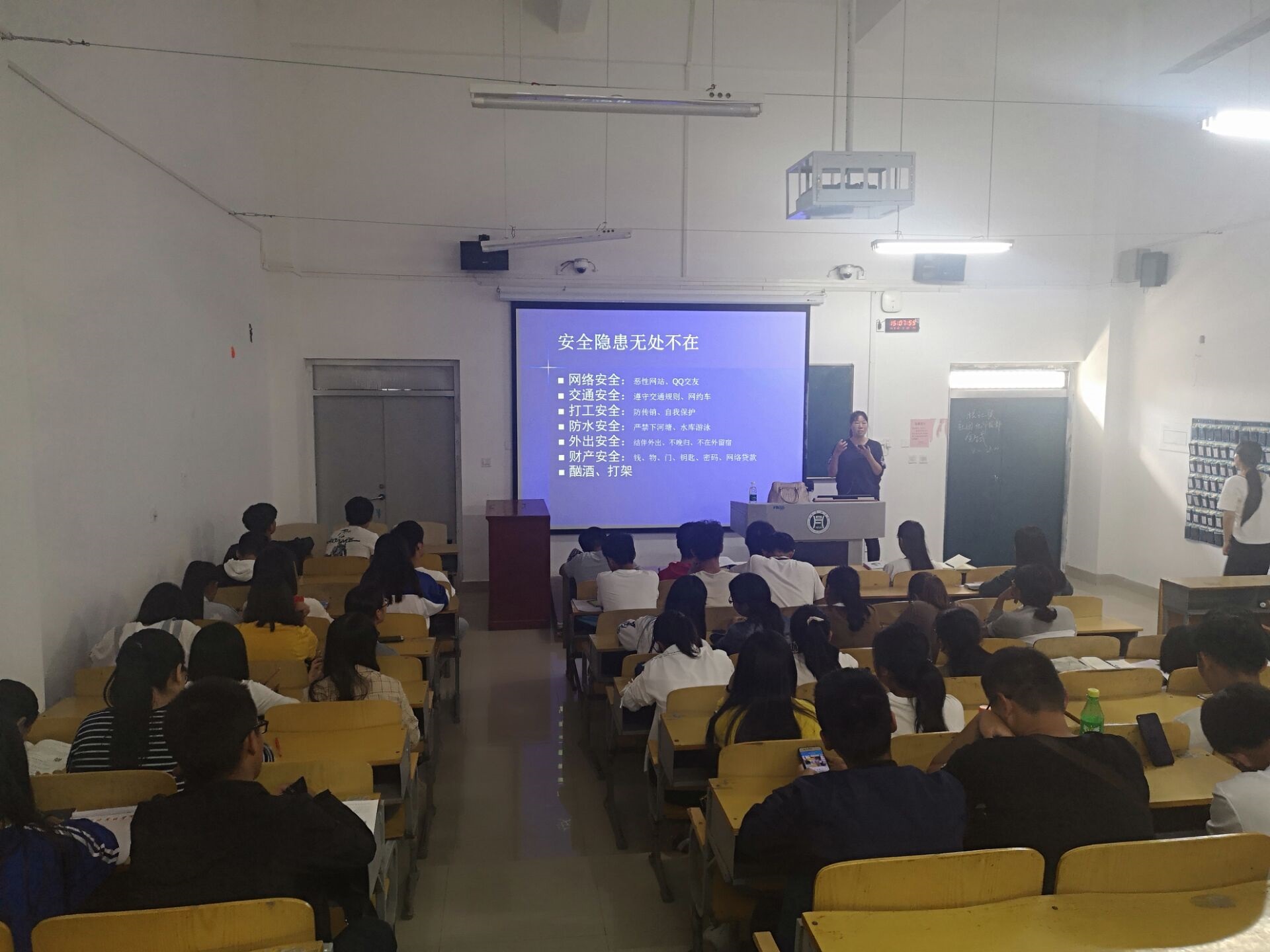 黄光玲老师结合自己多年学生管理工作经验和学校及周边的真实案件,从网络安全、打工安全、外出安全、财产安全等方面,简明扼要而又不失趣味地教导同学们如何提高安全防范意识和自我保护能力,告诫大家时刻提高安全防范意识,并掌握必要的安全自救常识与技能。
