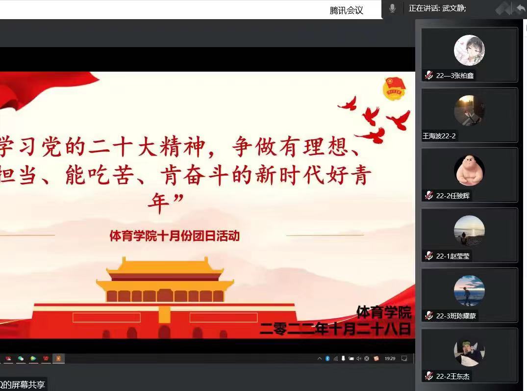 10月28日下午,体育学院团总支召开“学习党的二十大精神,争做有理想、敢担当、能吃苦、肯奋斗的新时代好青年”团日活动,22-2班团支书王明奇主持,休闲体育专业20、22级全体学生参加。