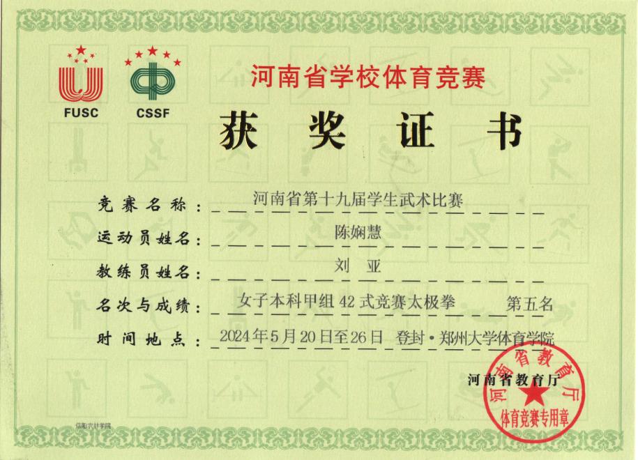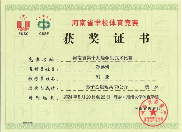 5月20日--24日,由河南省教育厅、河南省体育局主办,郑州大学体育学院承办的河南省第十九届学生武术比赛在郑州大学体育学院(登封校区)隆重举行。beat365在线平台官网武术代表队荣获第一、第五名的好成绩。