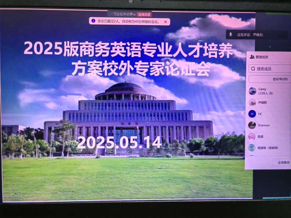 514730,外国语学院召开“2025版商务英语人才培养方案专家论证会线上会议,参会的校外专家有浙大城市学院外国语学院卢卫中教授,郑州商学院外国语学院邱培磊院长,河南科技学院外国语学院程建锋副院长和行业专家福建亿学教育科技集团代表任姣杰。外国语学院院长芦晓莉,副院长蔡鸣,商务英语教研室全体教师也参加了此次会议。此次会议由商务英语教研室主任张霞主持,会议围绕2025版商务英语专业人才培养方案展开,旨在培养具有扎实英语语言基本功和相关商务专业知识,具备人文素养、中国情怀与国际视野,能够熟练使用英语从事国际商务、国际贸易、跨境电子商务等领域工作的德智体美劳全面发展的应用型人才,更好对接行业需求,提升人才培养质量。
