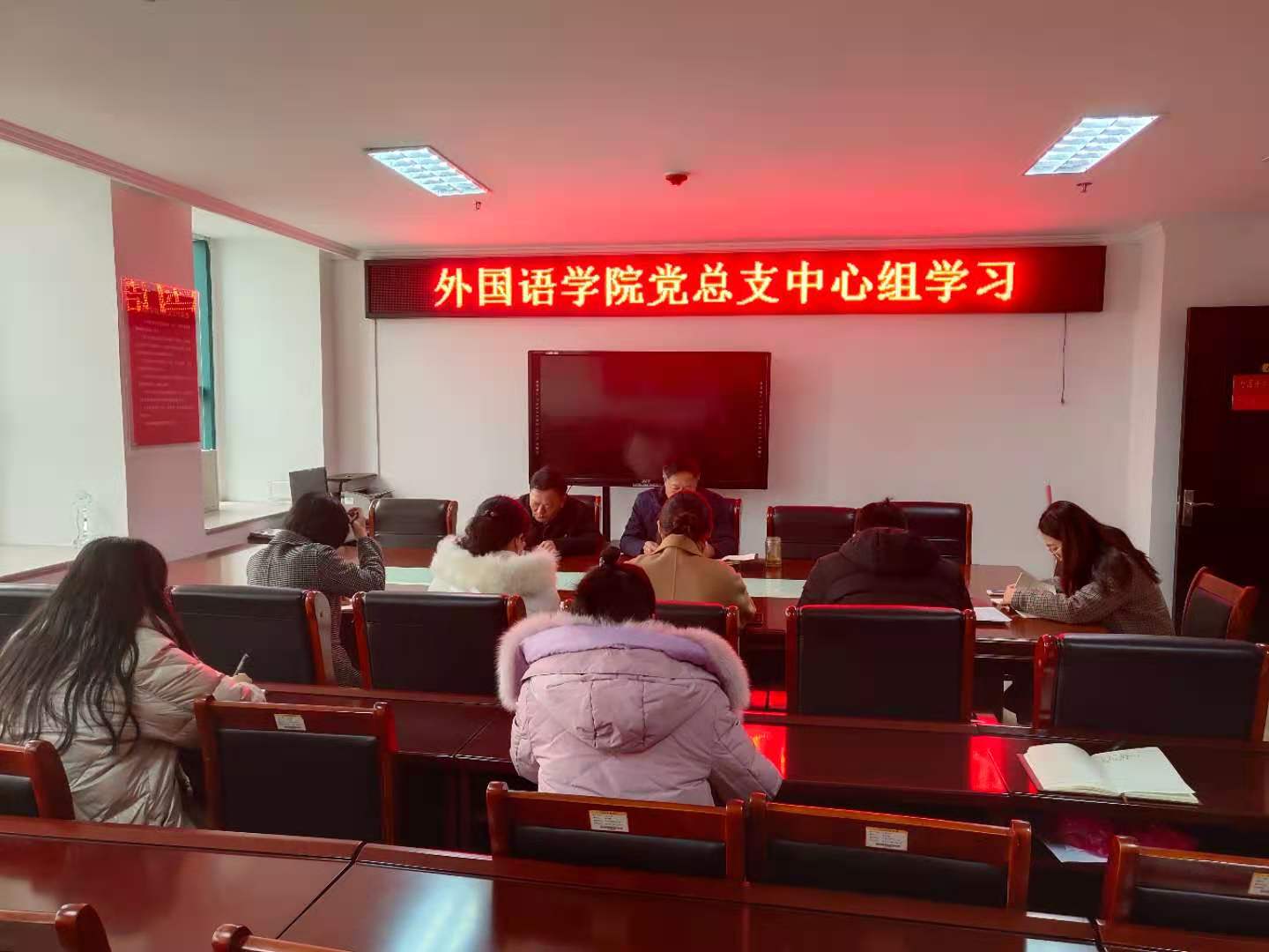 2020年11月24日,外国语学院在院办803党员活动室召开党总支中心组学习会,学院班子成员、总支委员、组织员、党支部书记参会,会议由党总支书记张志强主持。