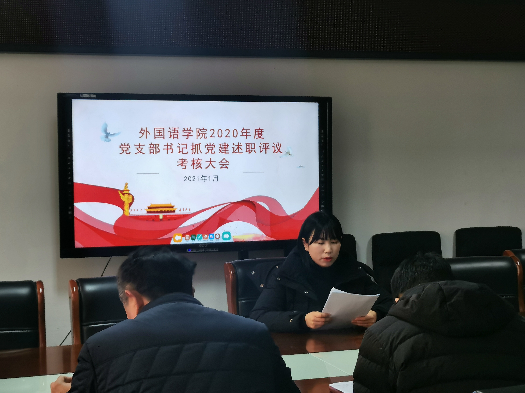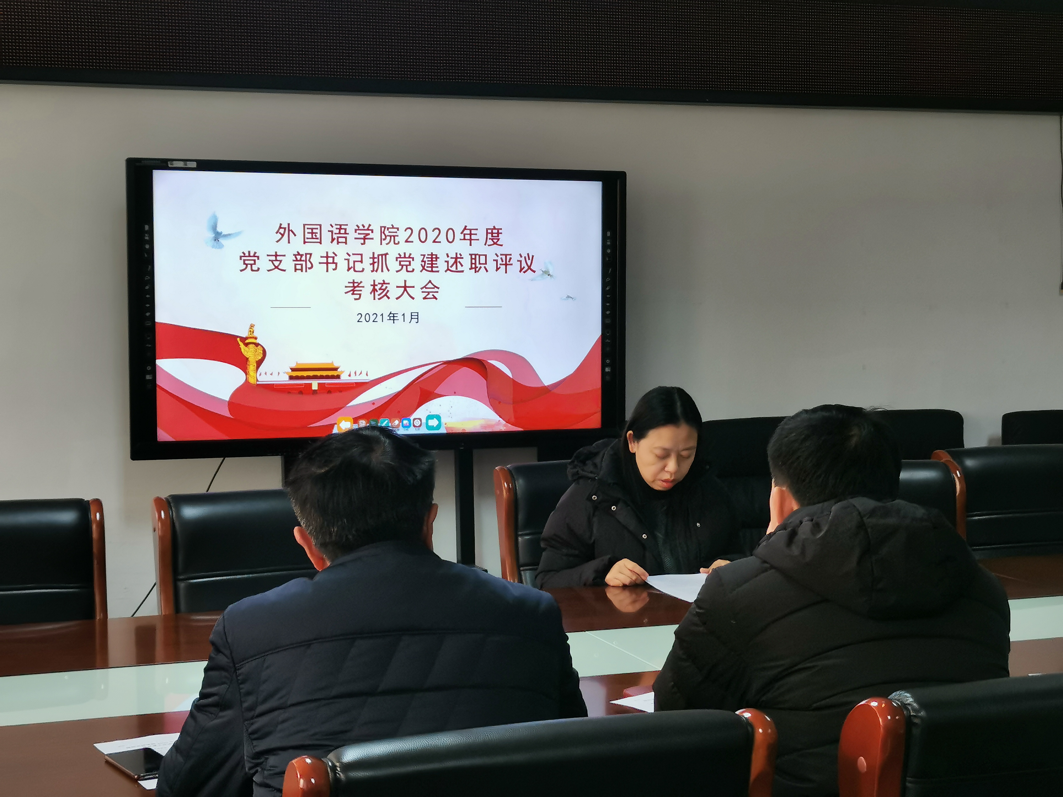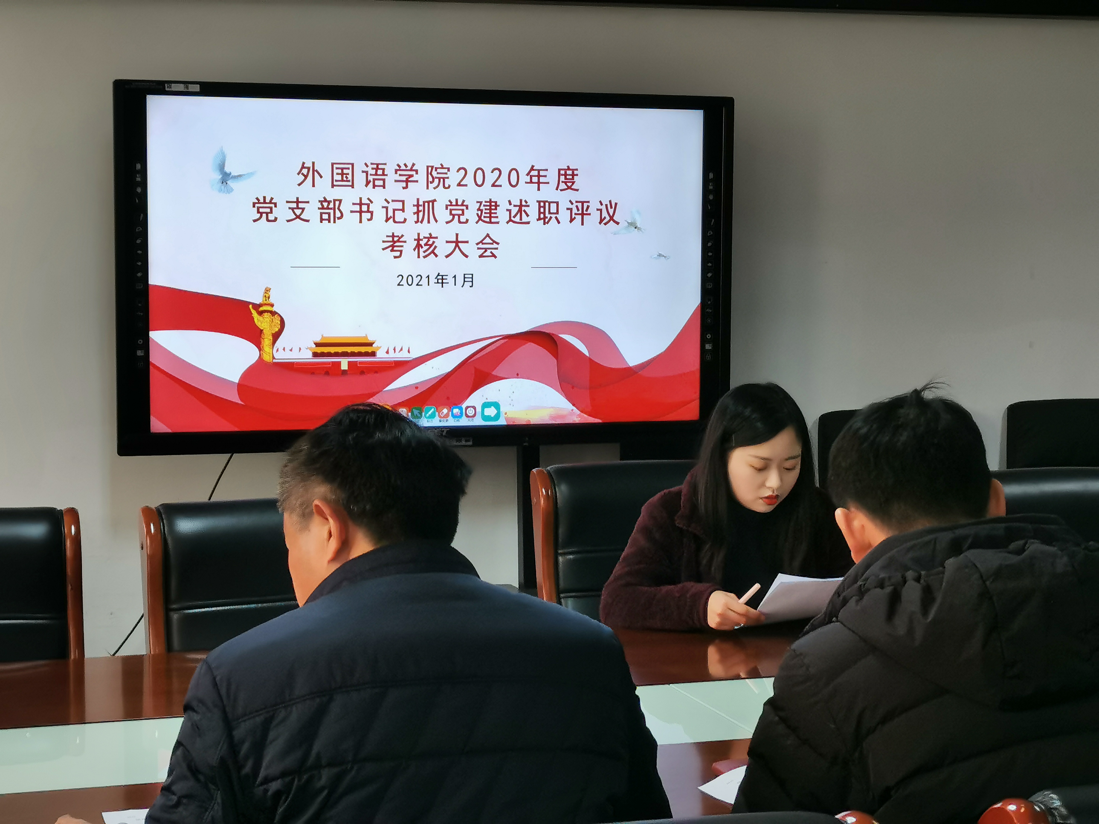 为深入学习贯彻习近平新时代中国特色社会主义思想和党的十九大精神,进一步落实管党治党政治责任,切实提高党建工作质量,2021年1月6日下午,外国语学院党总支在行政楼803召开2020年度党支部书记抓党建述职评议考核大会。院党总支书记张志强、副书记吴宏、各支部书记及支部党员代表参加了此次大会。