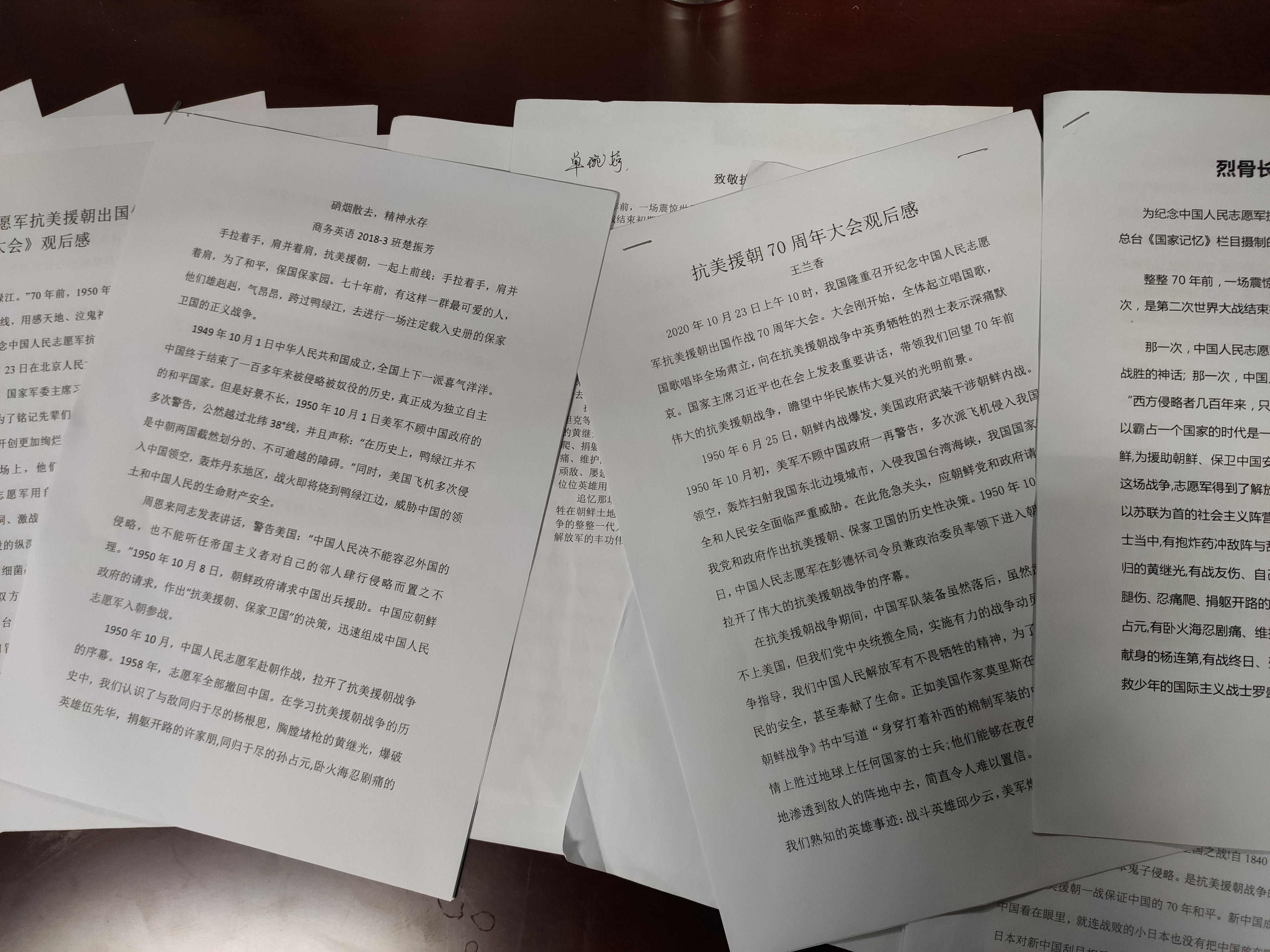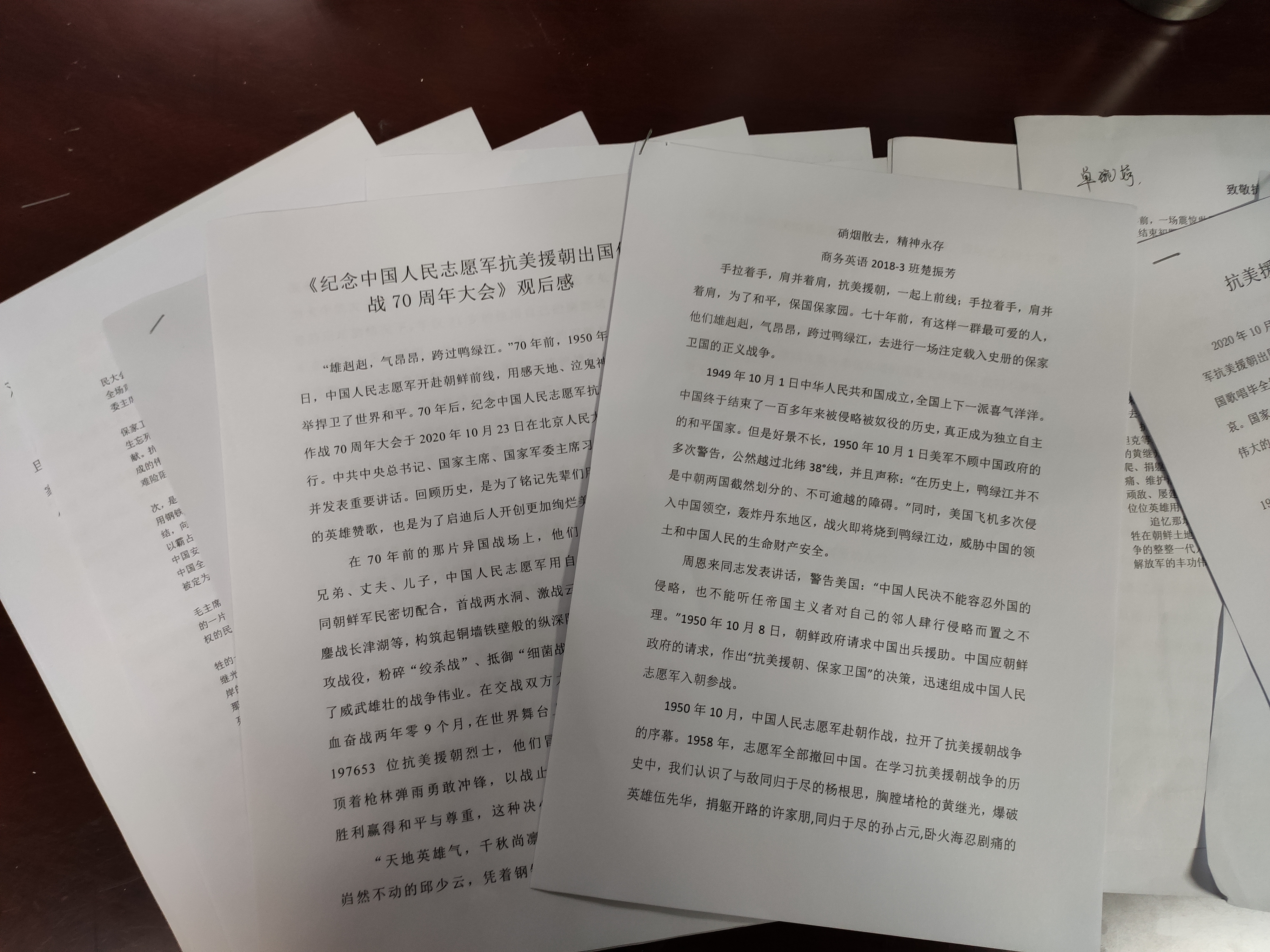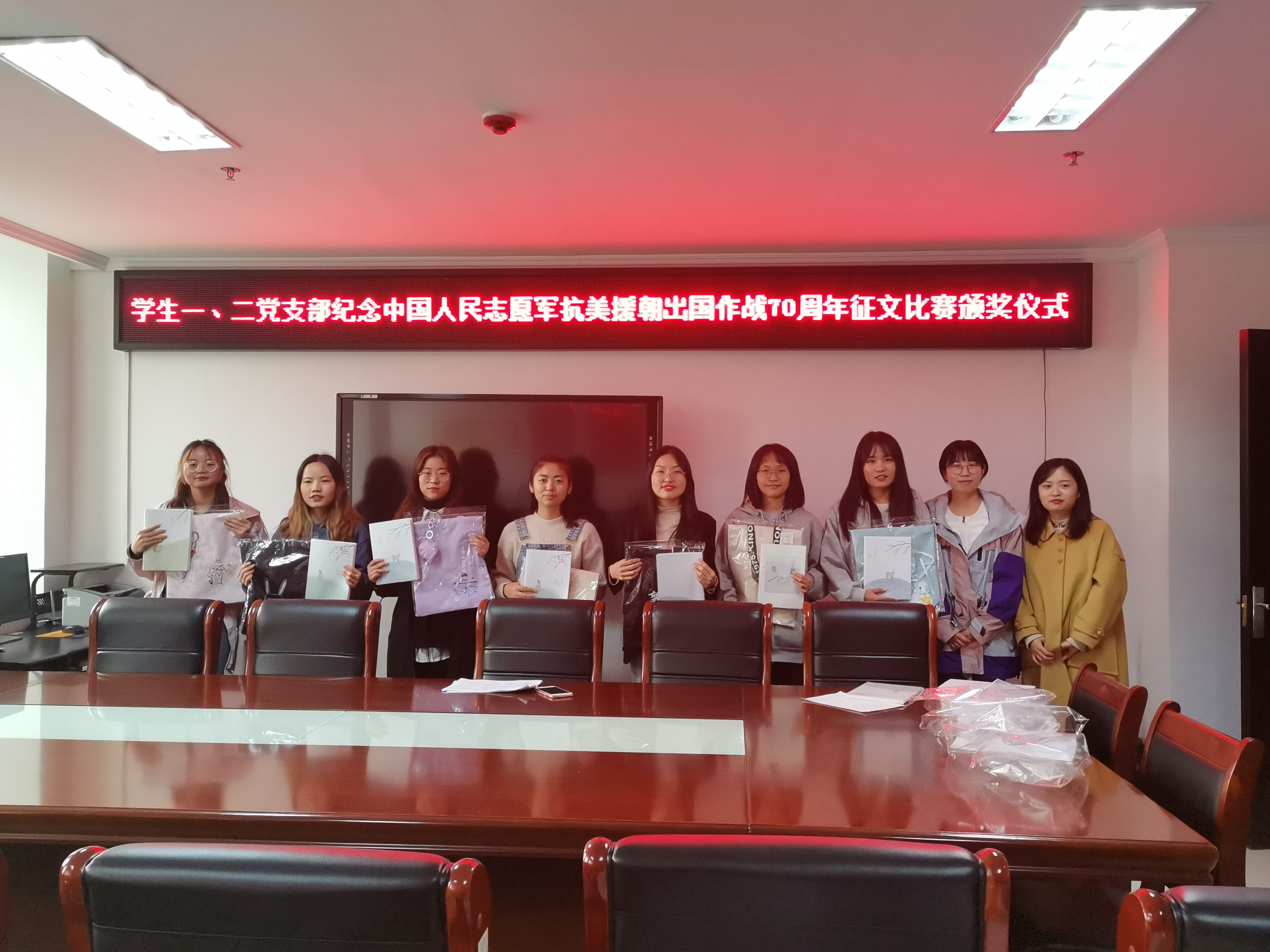 为纪念中国人民志愿军抗美援朝出国作战70周年,继承和弘扬抗美援朝精神,进一步激发我院学生党员的爱国情怀增强历史责任感和使命感。113日,外国语学院学生第一、二党支部行政楼803会议室开展“纪念中国人民志愿军抗美援朝出国作战70周年”学习教育会暨主题征文比赛颁奖仪式活动,学生党支部书记范琼琼、朱俊梵及全体学生党员参加。