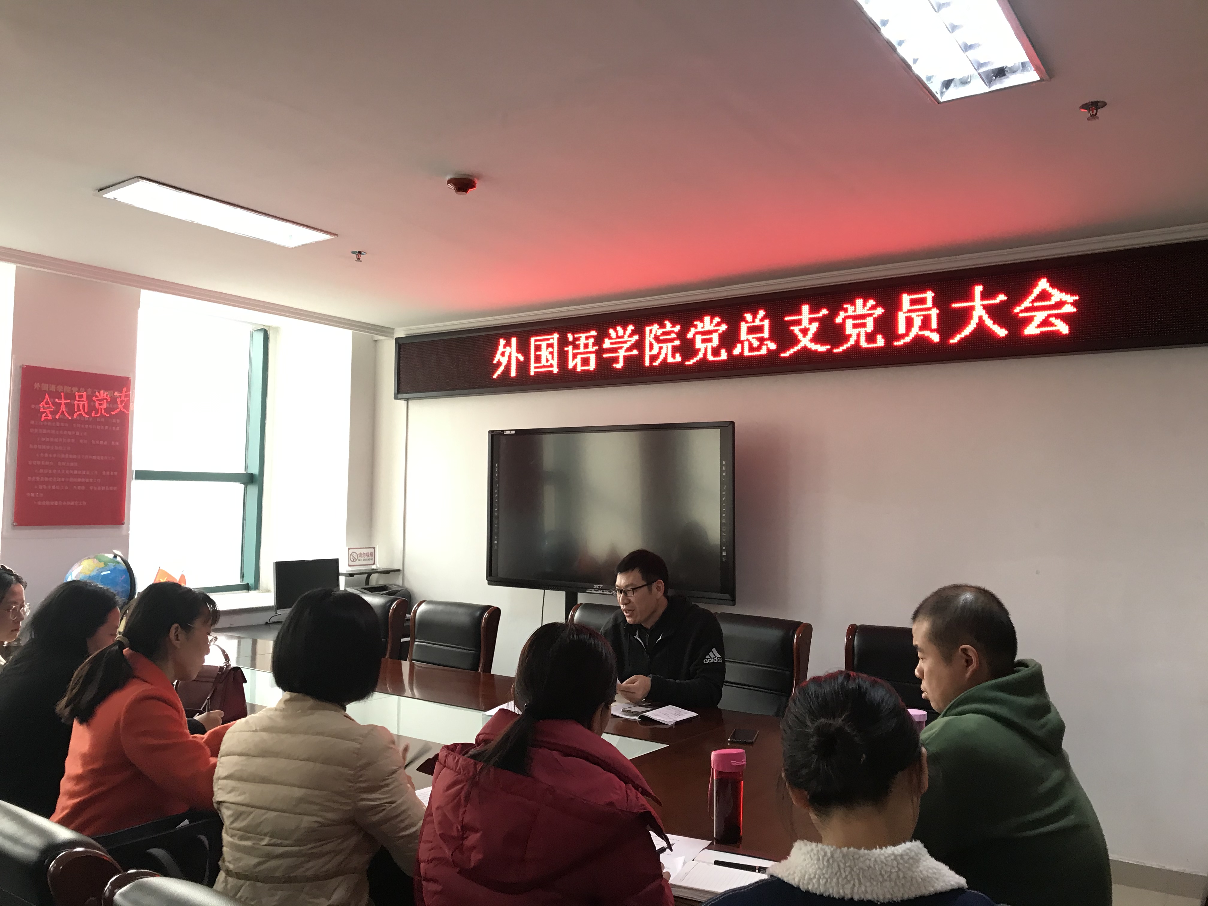 为进一步加强我院基层党组织建设,充分发挥基层党组织战斗堡垒作用,切实做好各项党建工作,12月10日下午,外国语学院党总支于院办803召开党员大会,会议由我院党总支副书记吴宏主持,副院长蔡鸣、学院班子成员、各党支部书记及全体教工党员参会。