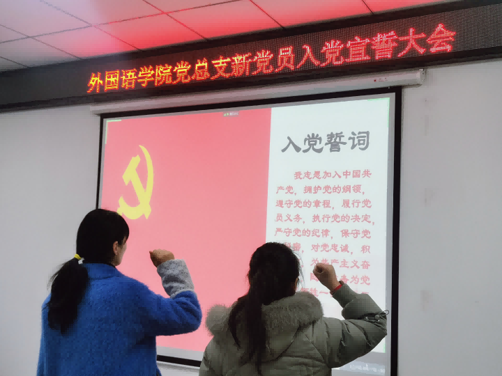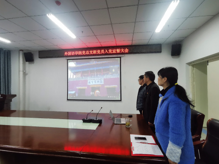 为加强新党员的党性教育,激励他们践行入党初心,外国语学院党总支于2022年1月4日上午10点在文学艺术楼402会议室举办了2021年秋冬学期新党员入党宣誓大会,本次入党宣誓大会采用线上线下同步的方式进行,外国语学院党总支书记张志强、副书记吴宏、外国语学院学生第一、二党支部书记高宇和赵瑞,39名学生预备党员、1名教师预备党员以及部分入党积极分子学生代表参加了此次大会。会议由赵瑞老师主持。
