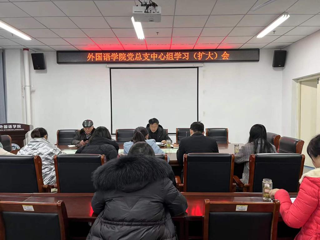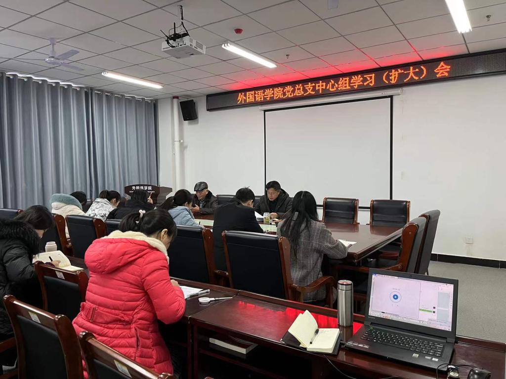 2022年1月6日下午3:00,外国语学院在文学艺术楼402会议室召开党总支中心组(扩大)学习会,会议由党总支书记张志强主持,学院科级及以上干部参会。