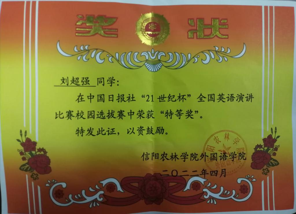 20223动员学生参加中国日报社“21世纪杯”英语演讲比赛,共有36名同学报名。在院领导的关心下,在院教师的精心指导下,学生经过一个多月的认真准备,按照要求提交了三分钟的主题演讲稿和演讲视频。经过五名评委的匿名打分,评出特等奖1名,一等奖6名,二等奖11名,三等奖18名。其中,刘超强作为特等奖的获得者,将代表beat365在线平台官网参加中国日报社“21世纪杯”英语演讲比赛河南省赛。