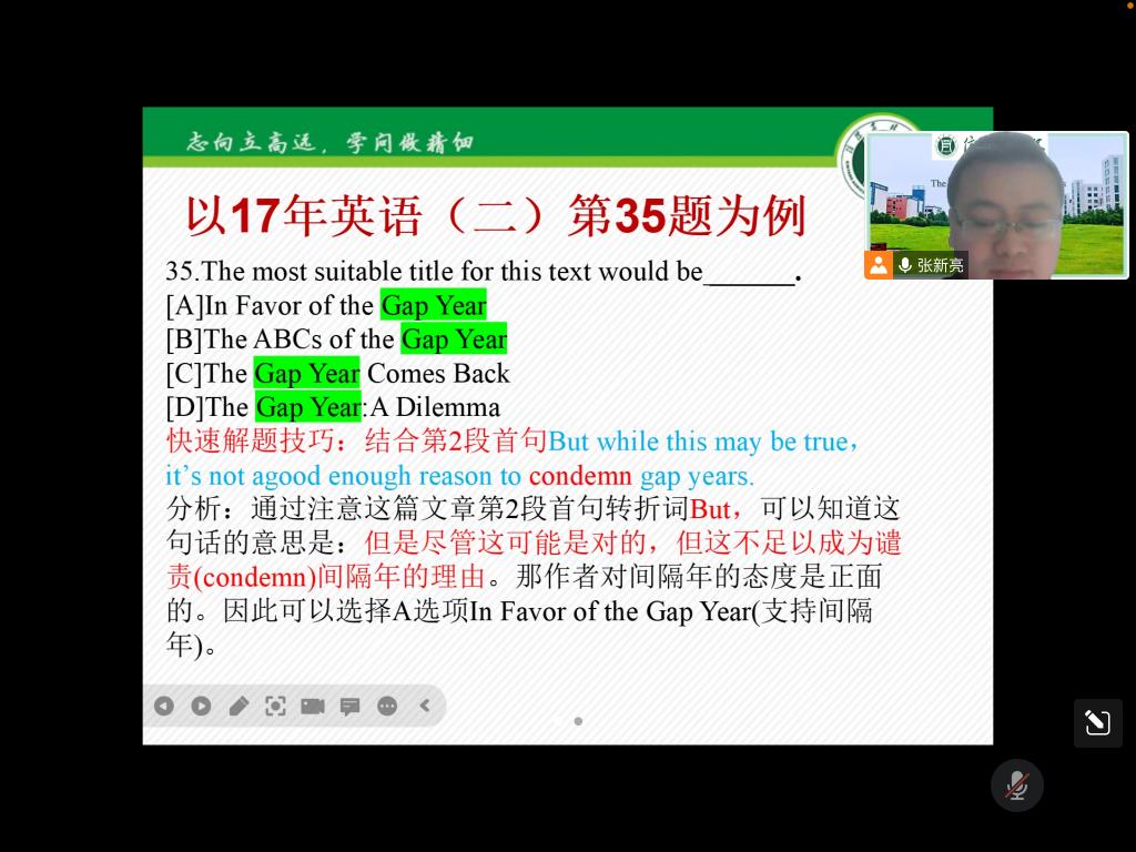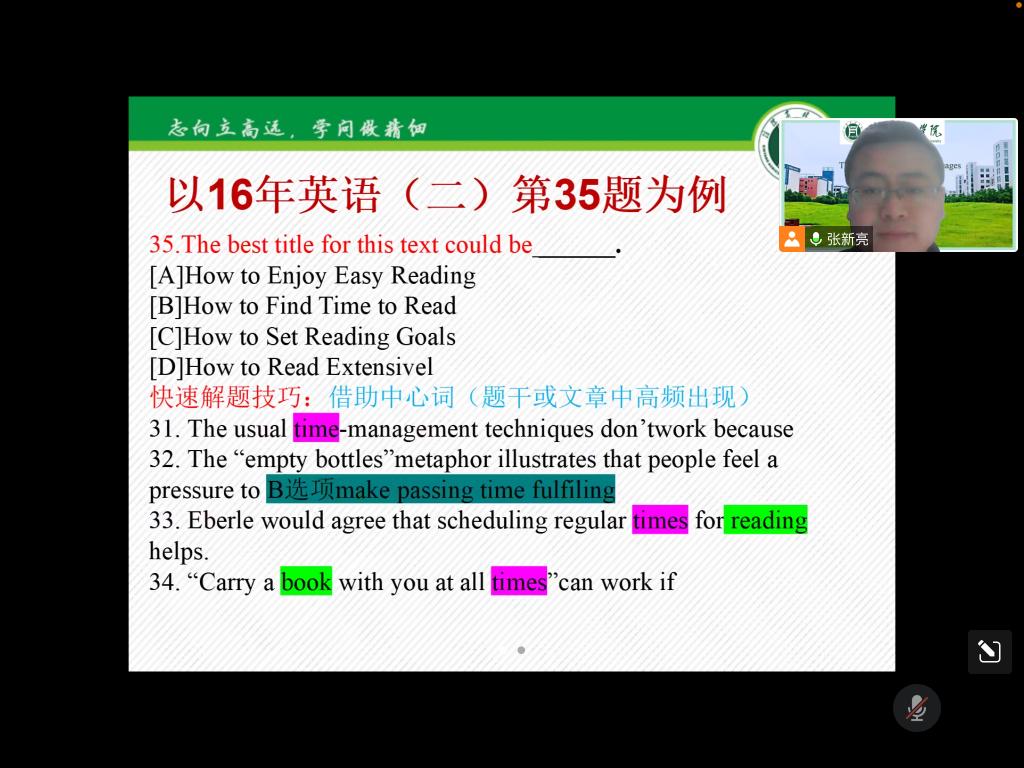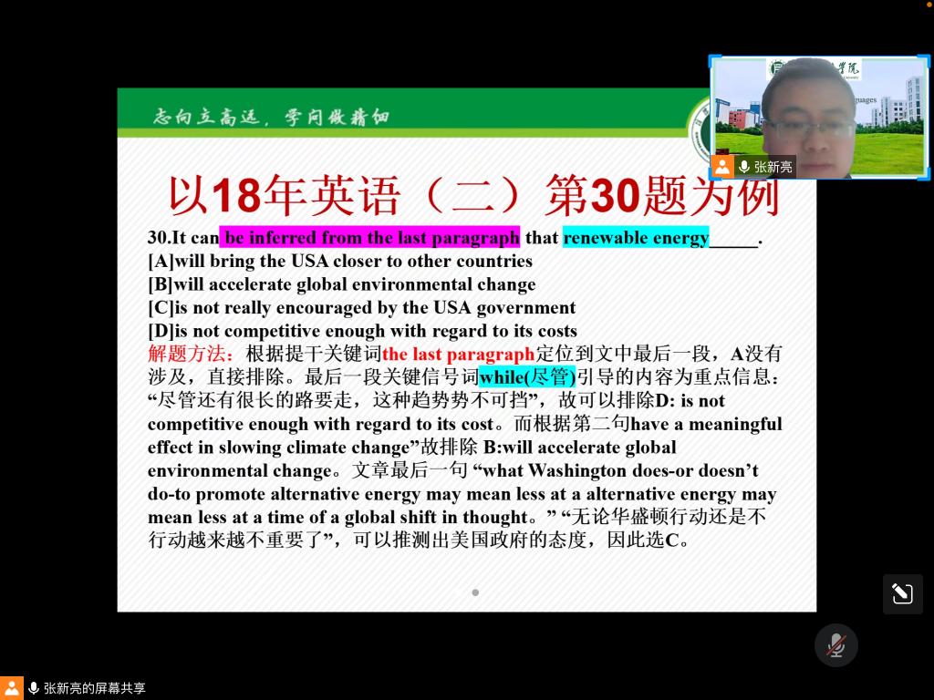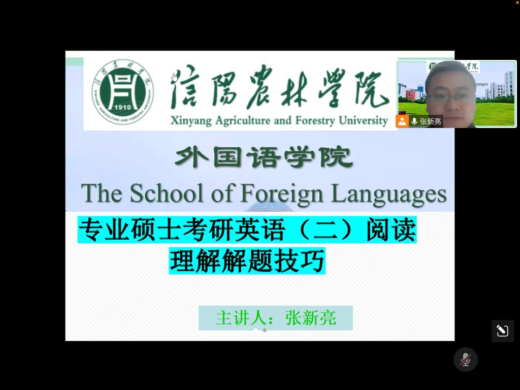 为帮助beat365在线平台官网学生更好掌握考研英语阅读理解的答题技巧,提高复习效率。11月28日晚上7:00由我院副院长芦晓莉博士组织成立的外国语学院考研英语服务团队通过腾讯会议面向beat365在线平台官网本科生进行了考研英语专题系列的第期讲座——“考研英语()阅读理解解题技巧”,此次讲座由张新亮老师主讲。