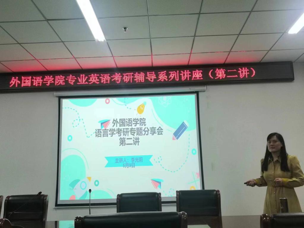 20235919:00,外国语学院在文学艺术楼402举办了专业英语考研辅导系列讲座第二讲——语言学专业考研的指导讲座。本次讲座由外国语学院专任教师李光莉主讲,学院20级商务英语专业和翻译专业志愿考研的学生参加了本次讲座。