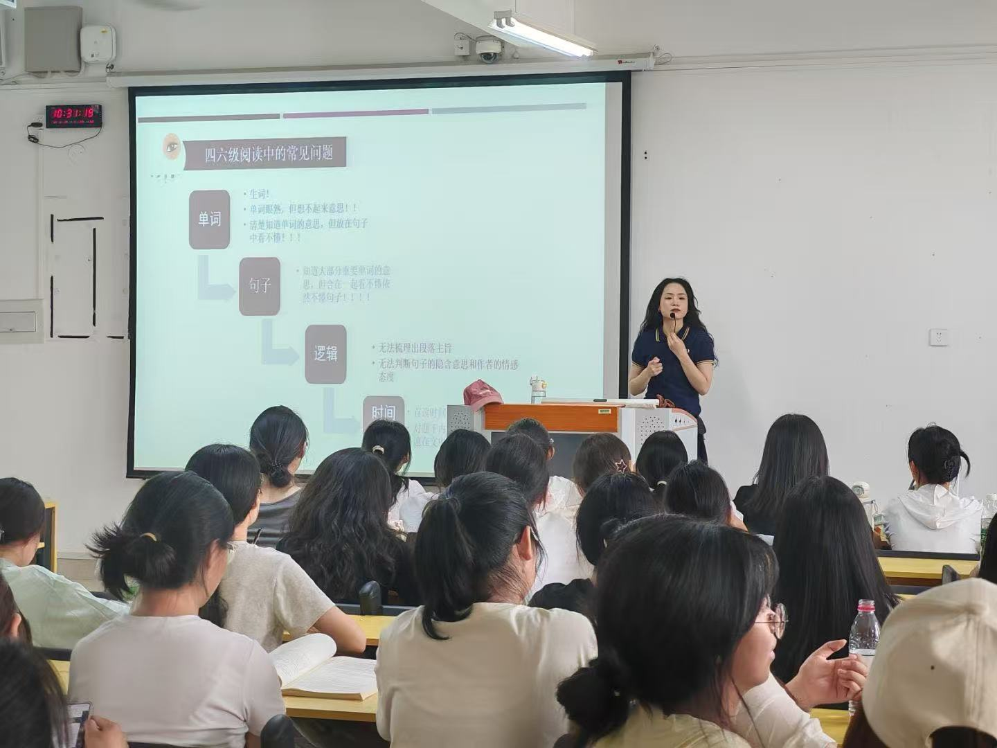 听力模块由李金慧老师主讲,重点解析考试大纲核心要求,剖析非英语专业学生常见学习误区,通过精听训练示范指导学生掌握科学训练方法。阅读模块黄露露老师创新采用题型对比教学法,结合真题解析揭示命题规律,传授意群阅读法等高效技巧。翻译模块王婉秋老师针对“下笔难”痛点,强调语法词汇积累重要性,通过错误类型分析提供解决方案。写作模块韩江霞老师以大纲解读为切入点,通过现场练笔强化写作规范,解决学生实际问题。
